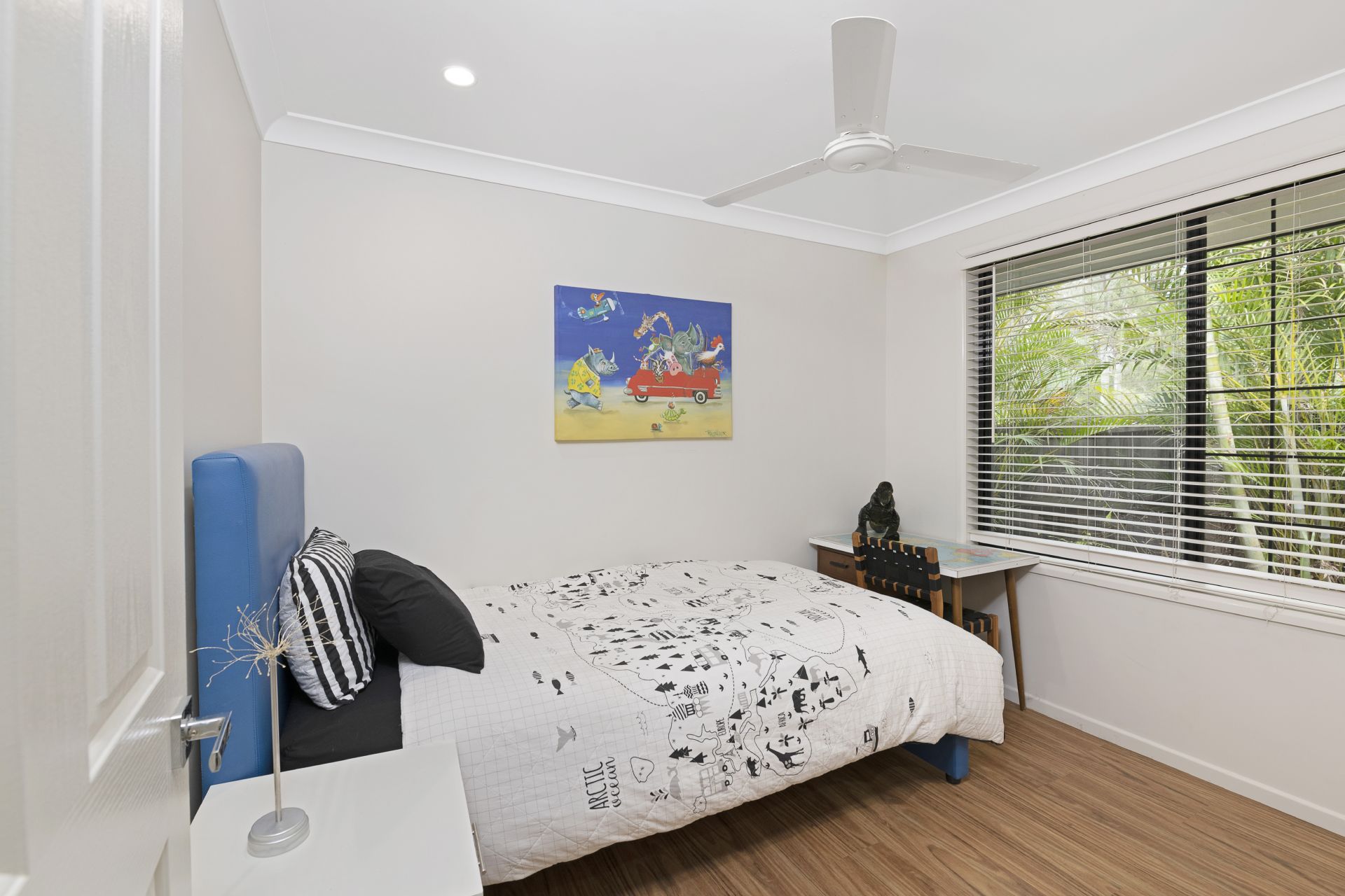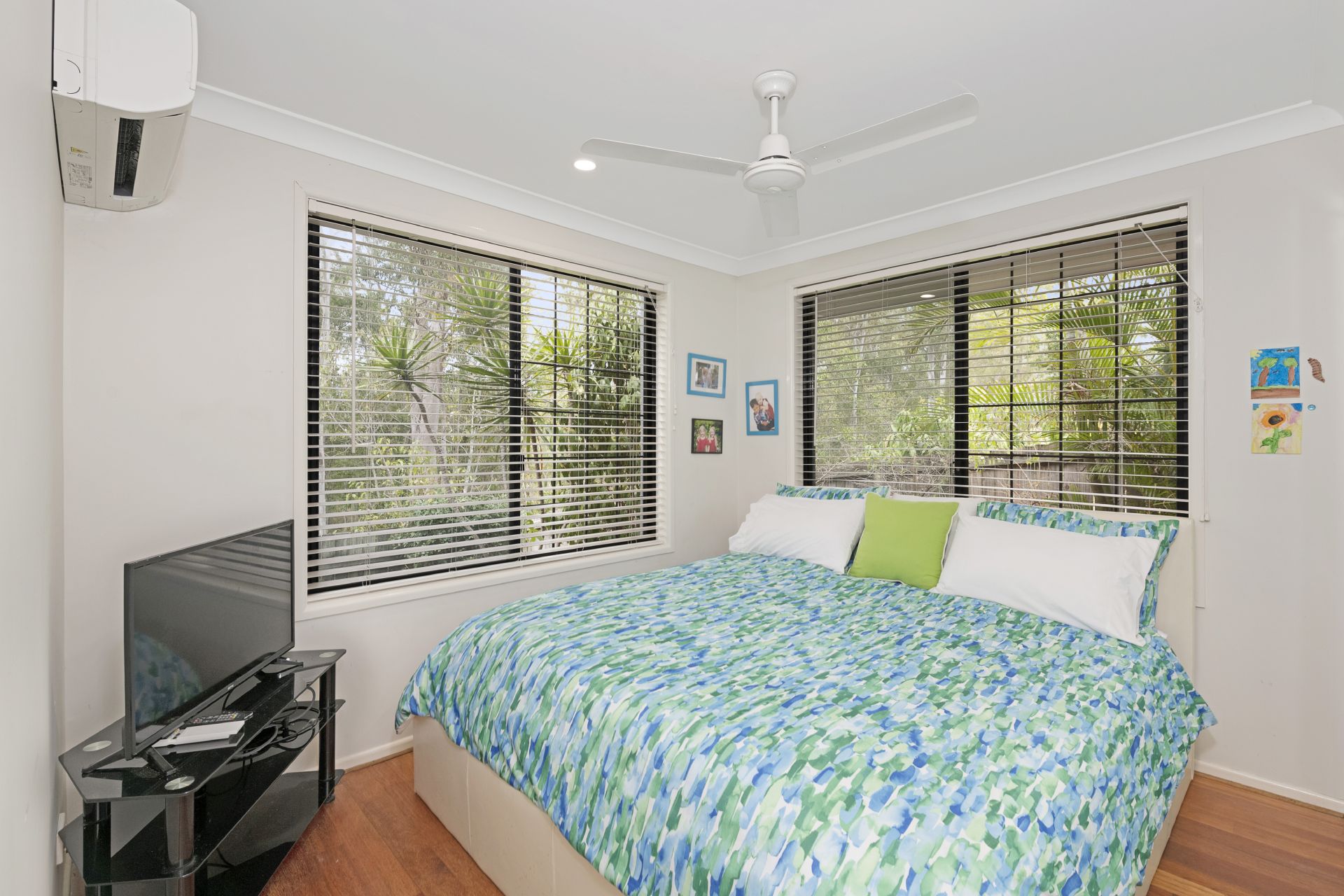 > Bedroom 3 enjoys split system air-conditioning, mirror fronted built-in-robe, blinds, timber flooring, ceiling fan, security screens and a private elevated view overlooking bushland reserve that you won't want to leave.