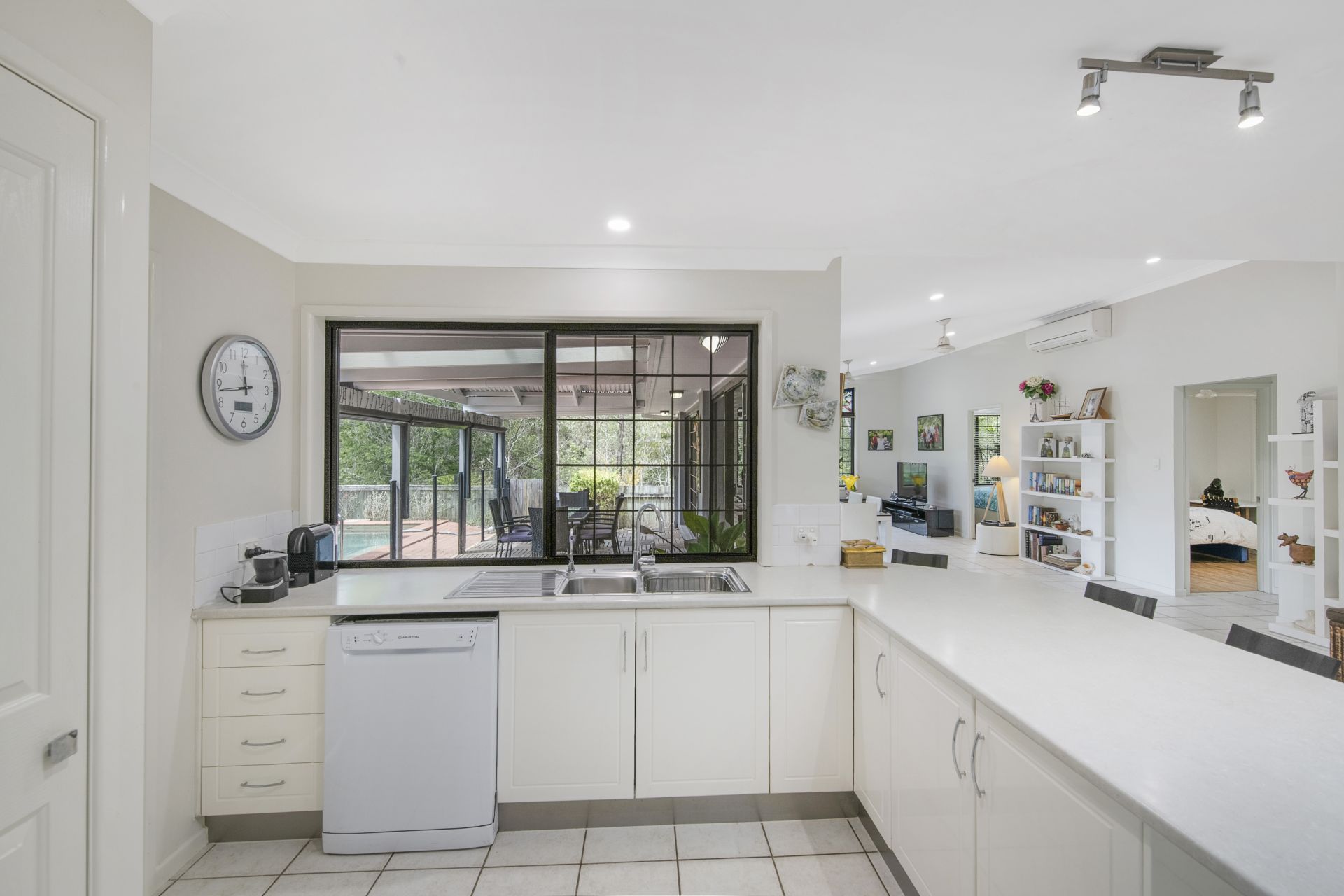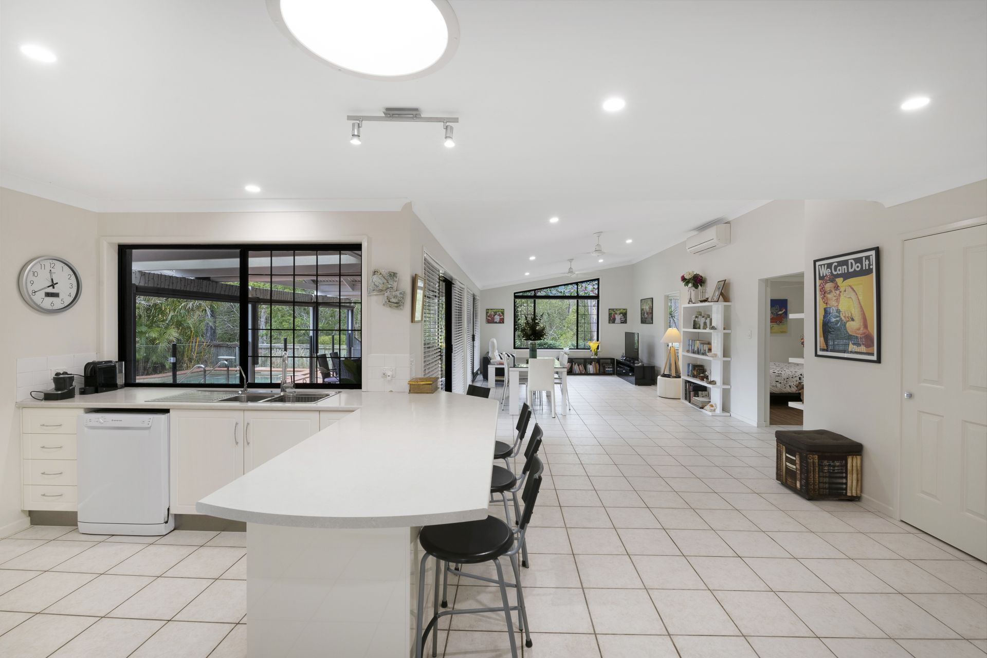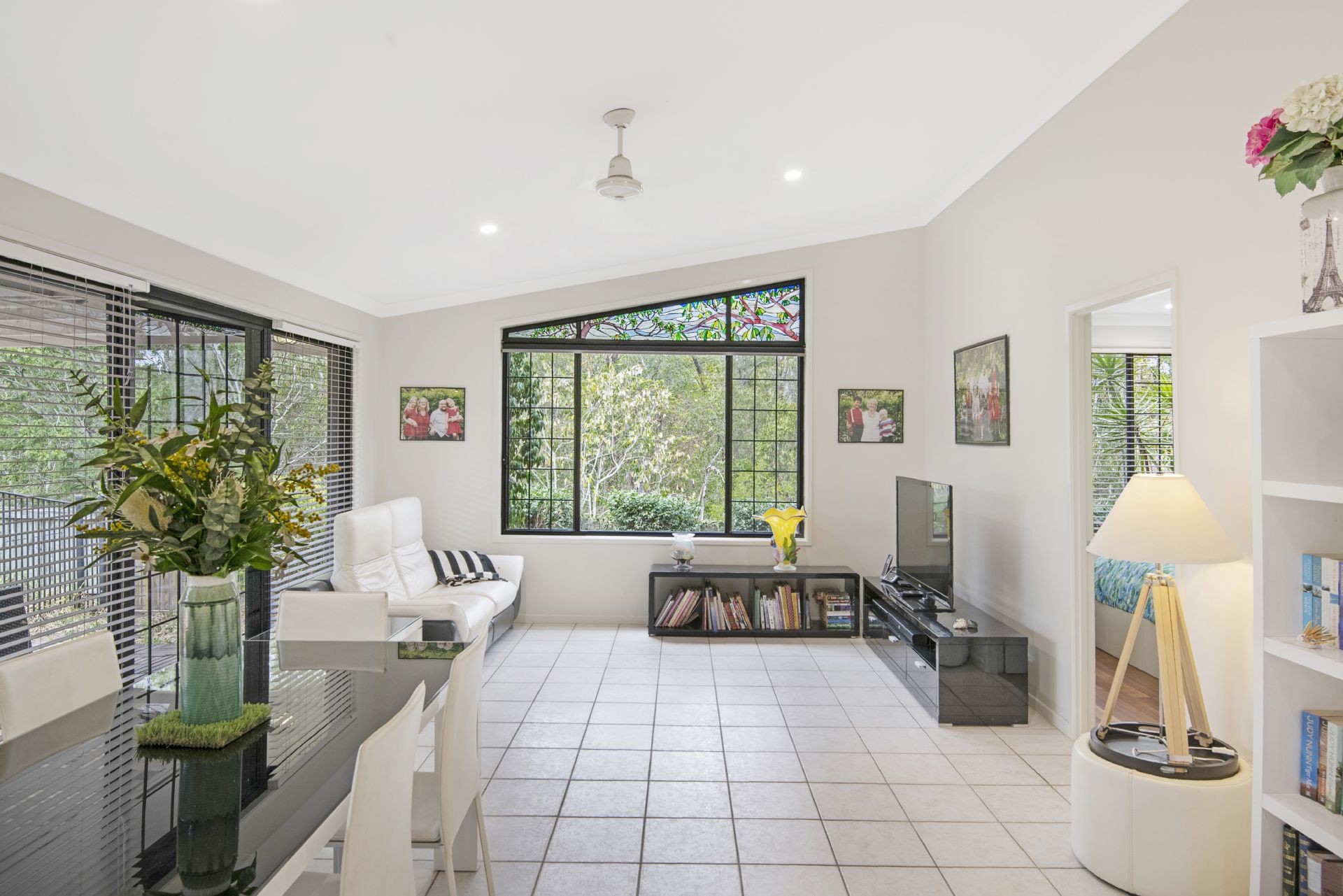 > The open plan main living/meals area flows effortlessly from the kitchen and out to the covered outdoor entertaining area. Features include vaulted ceilings up to 3.1m, beautiful framed window featuring a stained glass mosque overlooking the bushland reserve, tiled flooring, split system air-conditioning, ceiling fans, security screens, blinds, sliding doors and LED down-lights throughout.