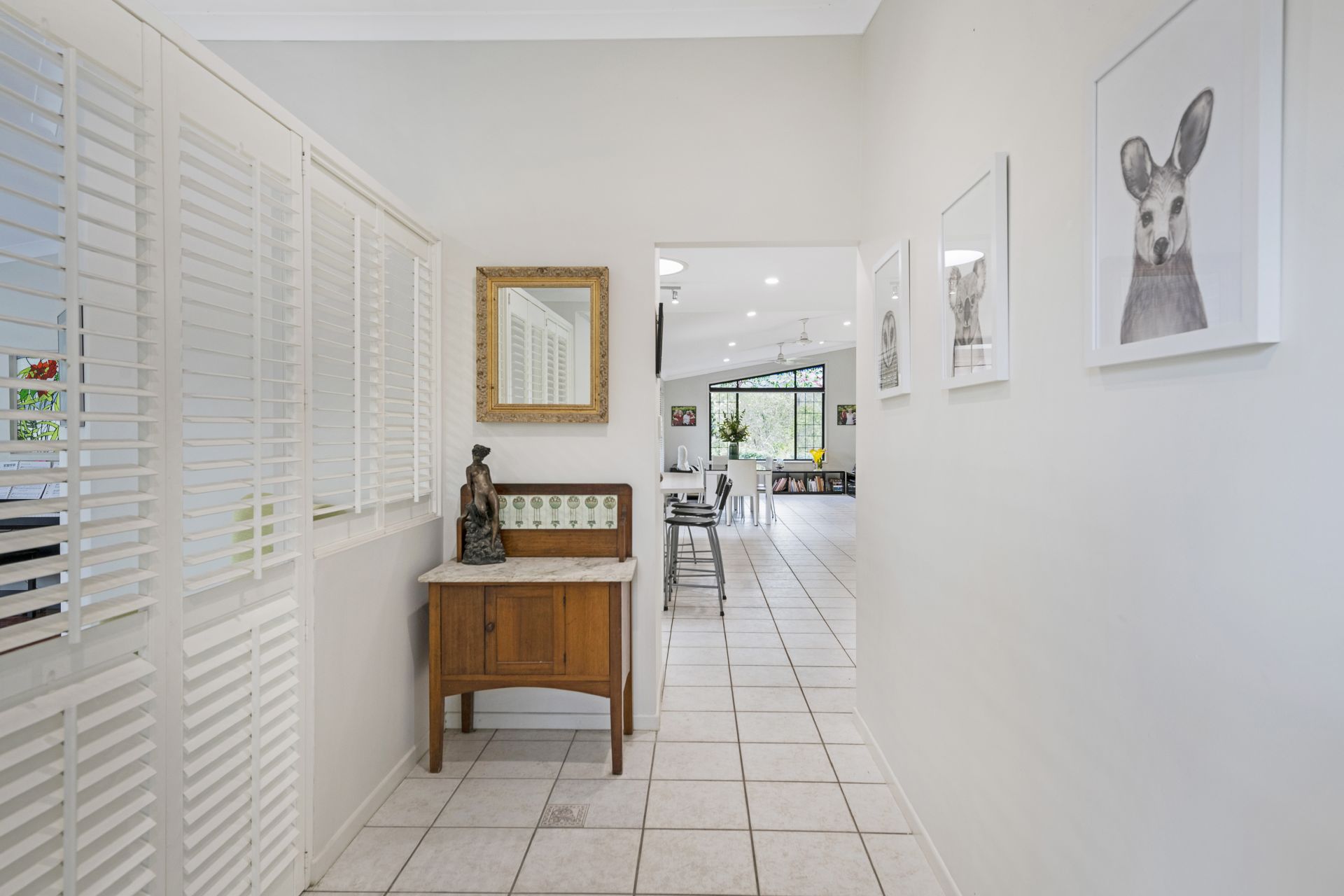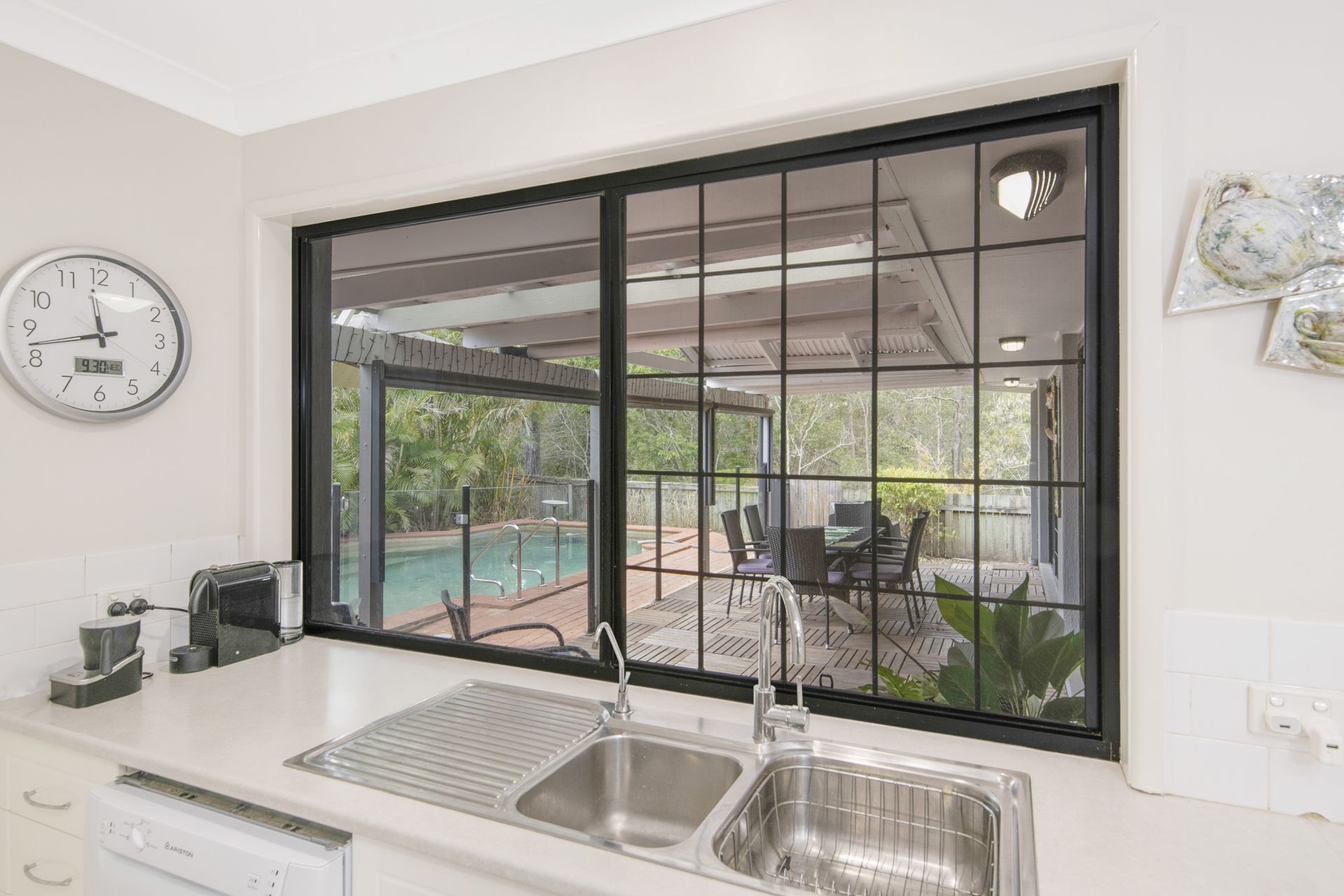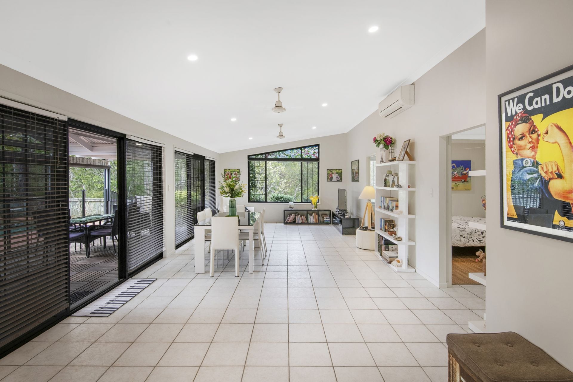 > The open plan main living/meals area flows effortlessly from the kitchen and out to the covered outdoor entertaining area. Features include vaulted ceilings up to 3.1m, beautiful framed window featuring a stained glass mosque overlooking the bushland reserve, tiled flooring, split system air-conditioning, ceiling fans, security screens, blinds, sliding doors and LED down-lights throughout.