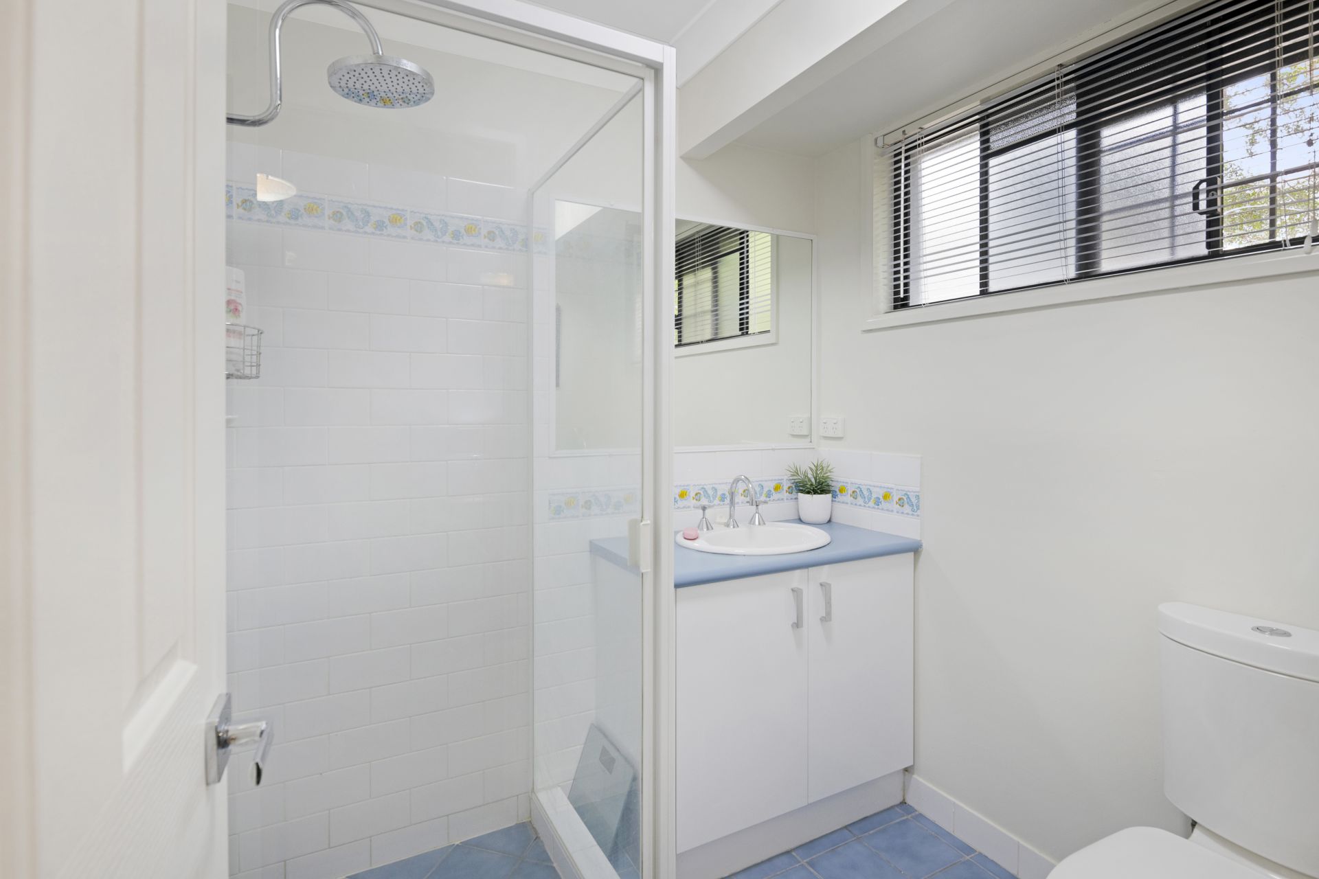 > The master ensuite boasts a clear glass shower, generous sized vanity, plenty of storage and separate toilet.