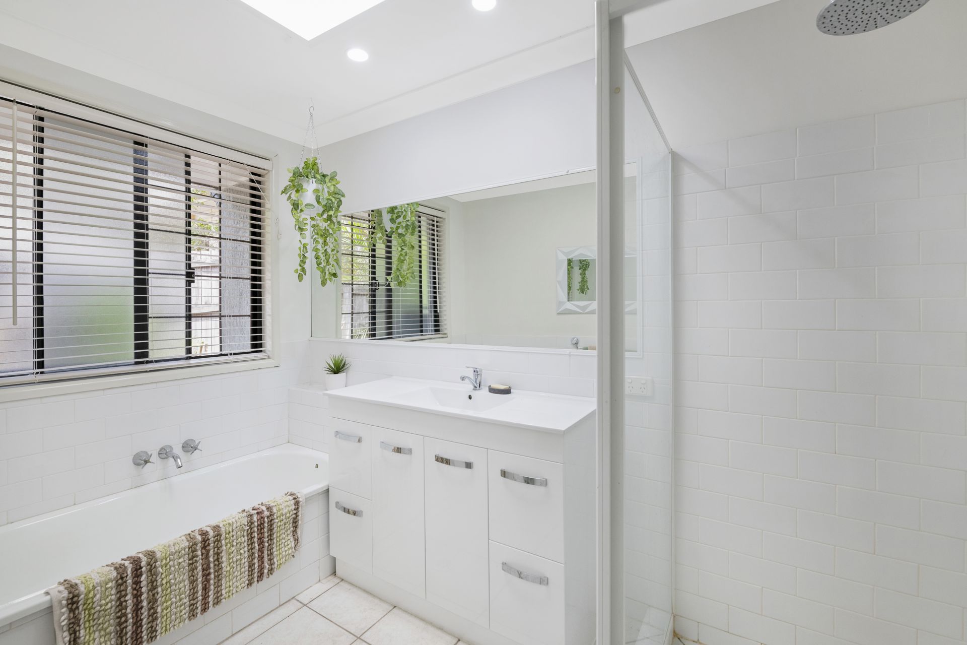 > The main bathroom features large clear glass shower with rainfall and detachable shower head, skylight, separate bath, stone top vanity, plenty of storage and separate toilet.