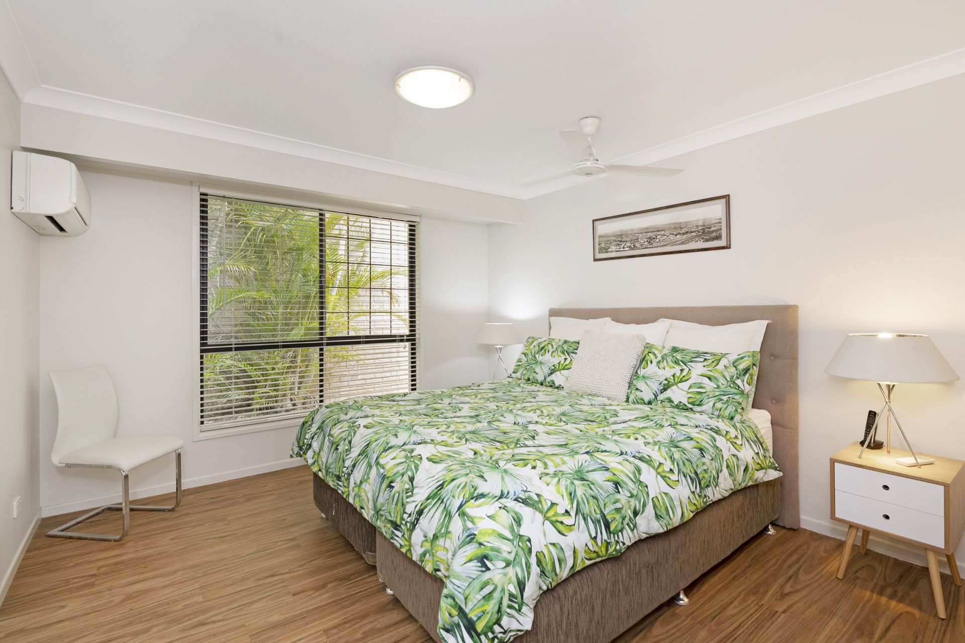 > The spacious master is perfect for those who enjoy their own space, boasting split system air-conditioning, ceiling fan, timber look flooring, new LED down-lights, security screens, walk-in-robe plus ensuite.