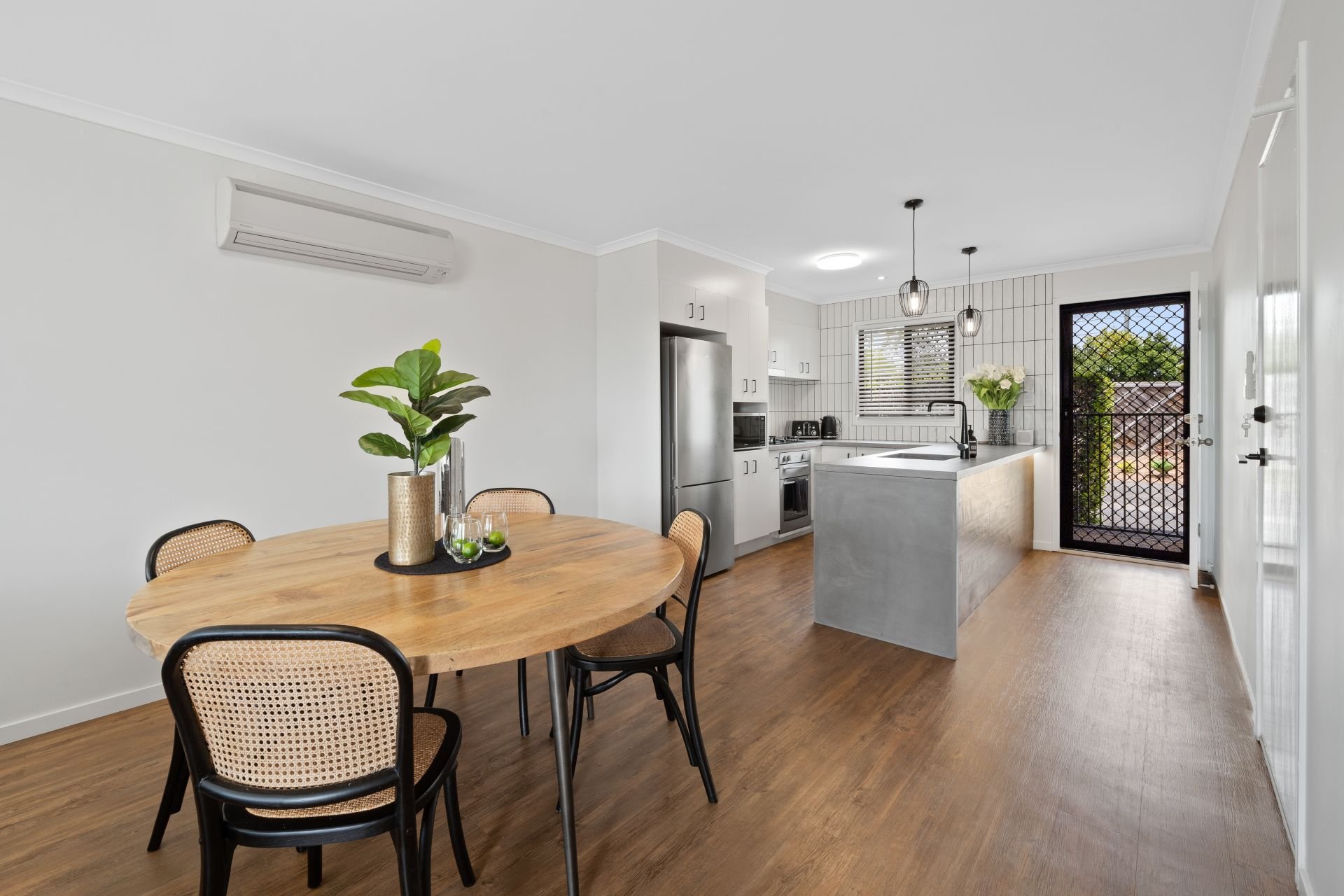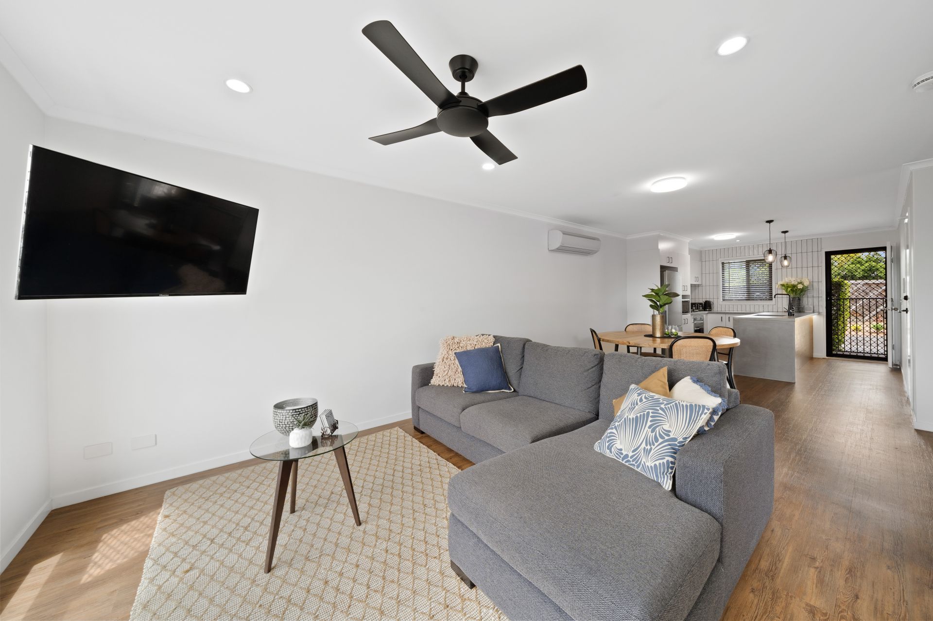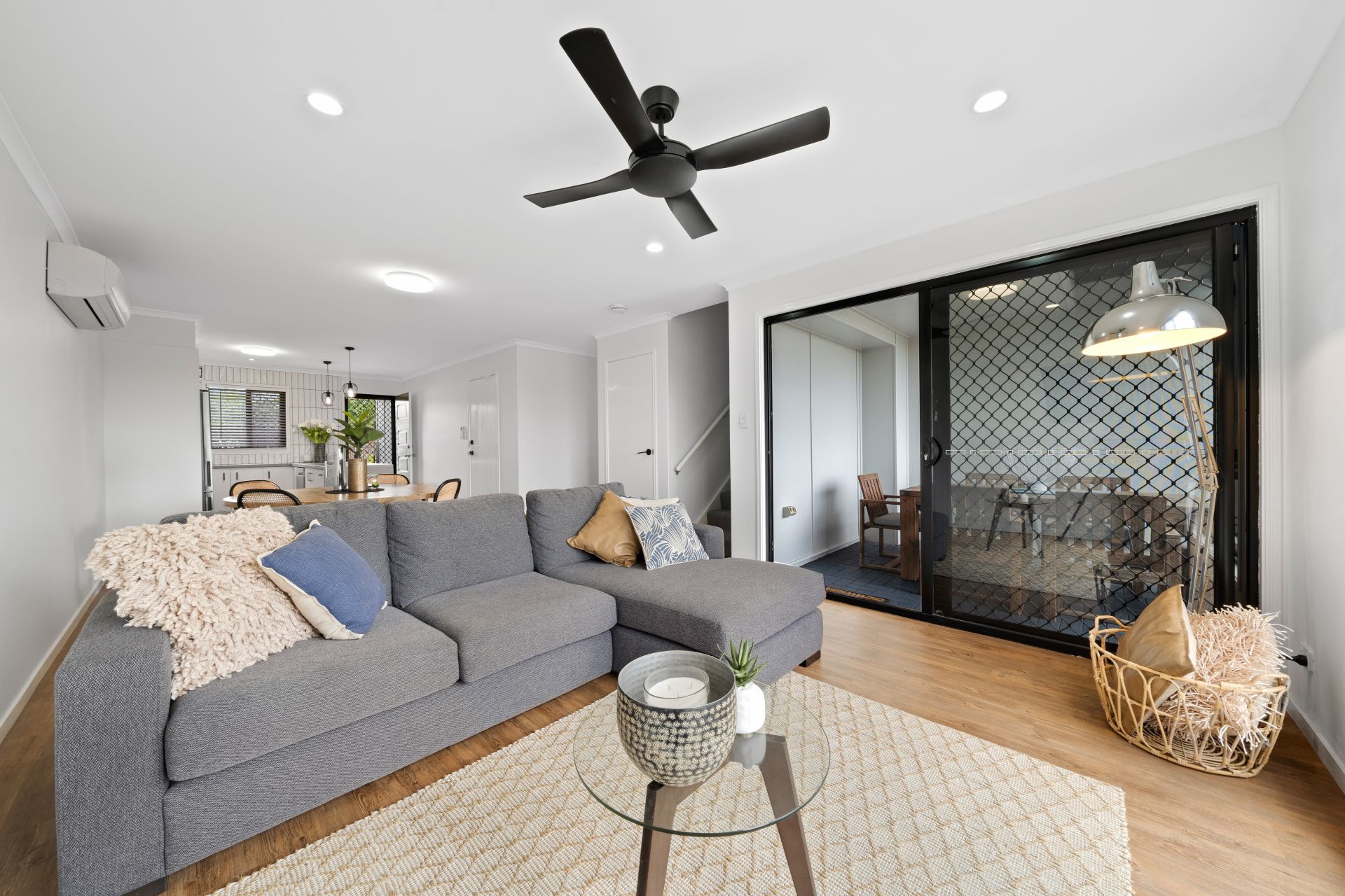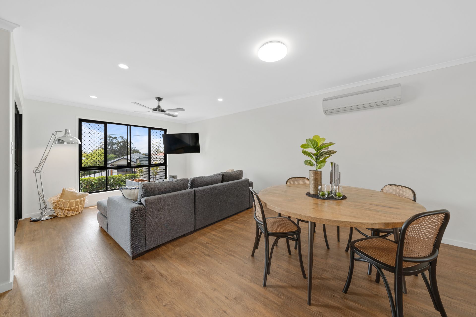 > The combined lounge/dining area, located at the heart of the home features durable wood-look flooring, oyster + down lighting, sliding windows with security + fly screens and access to the large split level semi covered outdoor entertaining area via the dual glass sliding door offering a seamless flow of living space