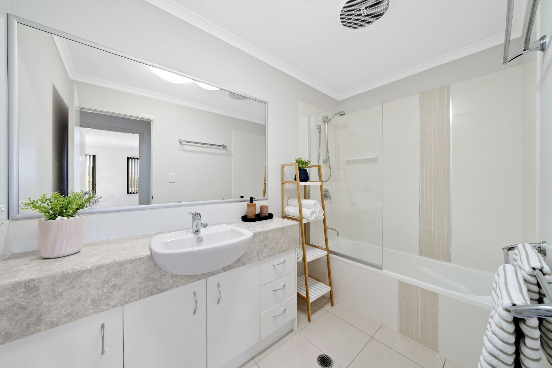 > The main bathroom features a single basin vanity with plenty of storage, large framed vanity mirror, towel rails, shower-over bath configuration with detachable showerhead and separate toilet