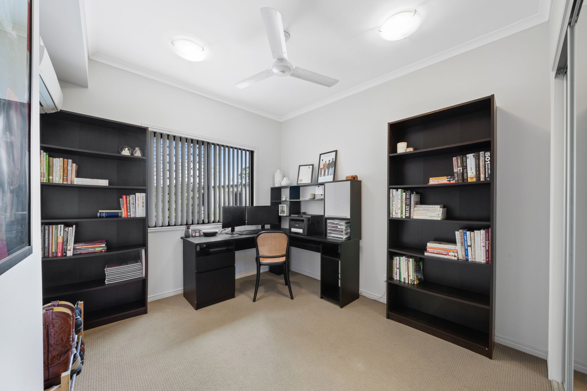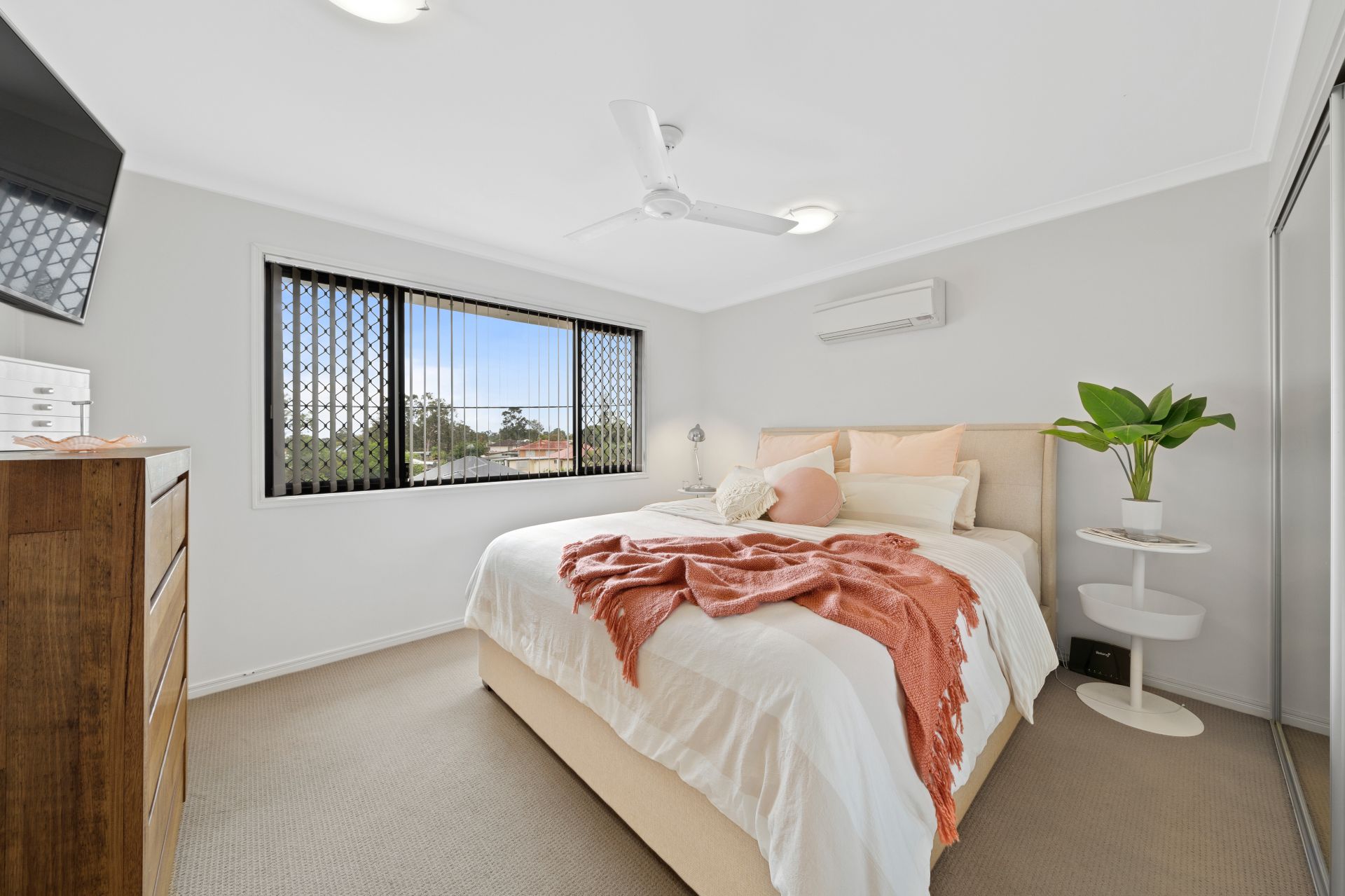 > Bedrooms 2 & 3 features carpet flooring, built-in-robe, vertical blinds, security + fly screens, traditional sliding windows, ceiling fan, oyster lighting and Dakin air-conditioning