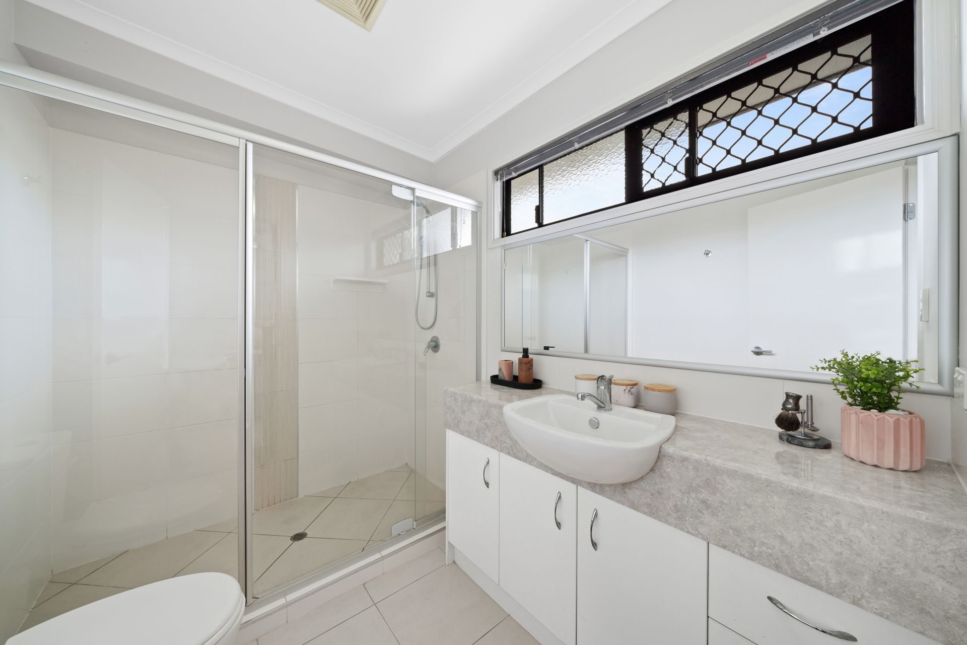 > The ensuite to bedroom one features a single basin vanity with plenty of storage, large framed vanity mirror, towel hooks, huge walk-in shower with detachable shower head and toilet
