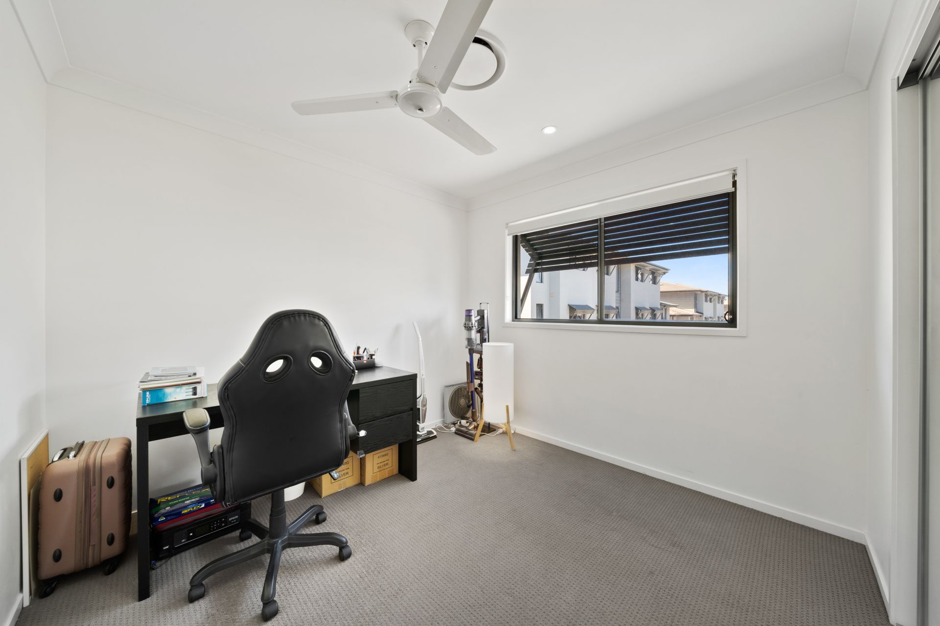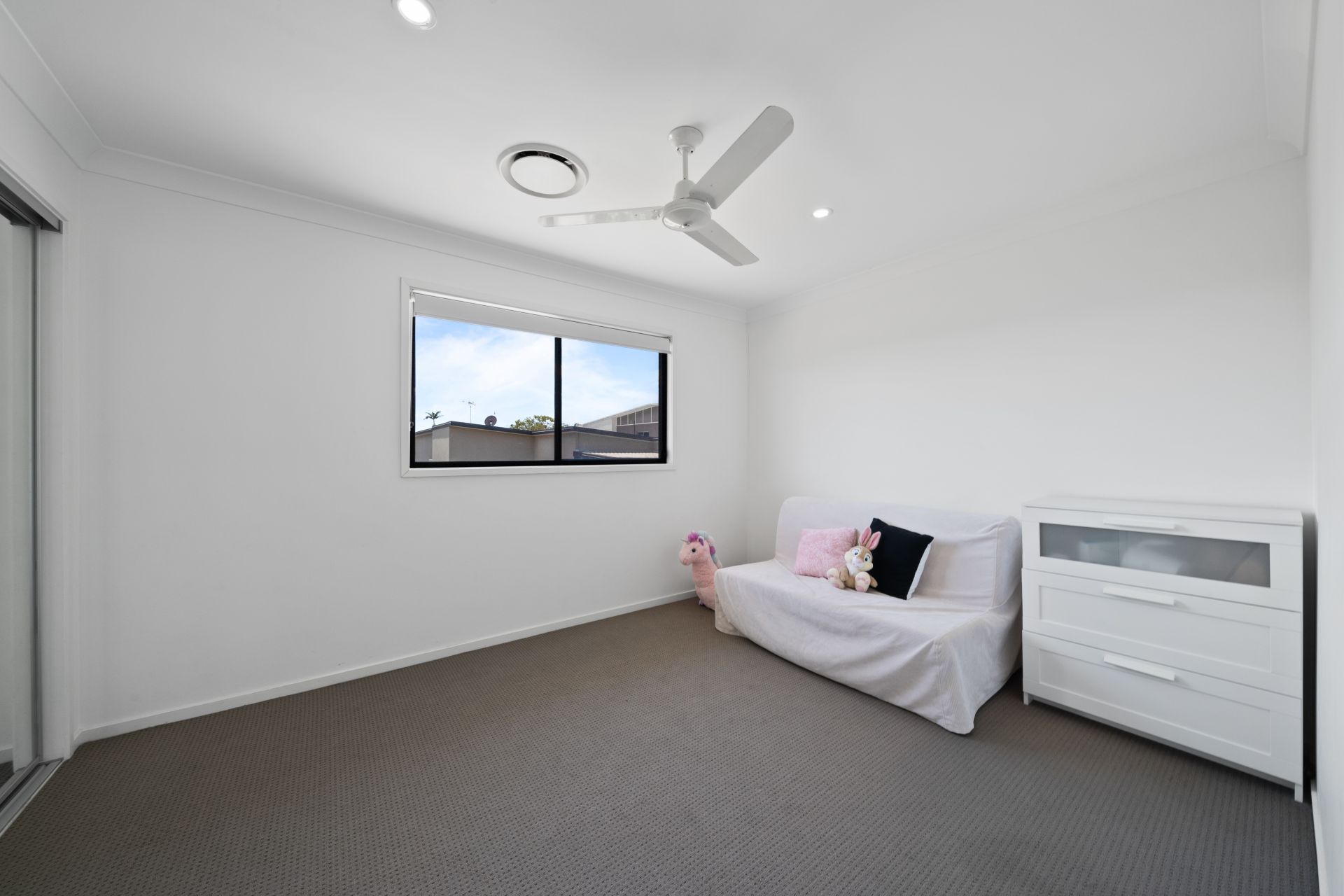 > Located on the main living level of the home is bedroom 3 boasting ducted air-conditioning, ceiling fan, carpet flooring, mirror faced built-in-robes and modern sliding windows with roller blinds and down-lighting