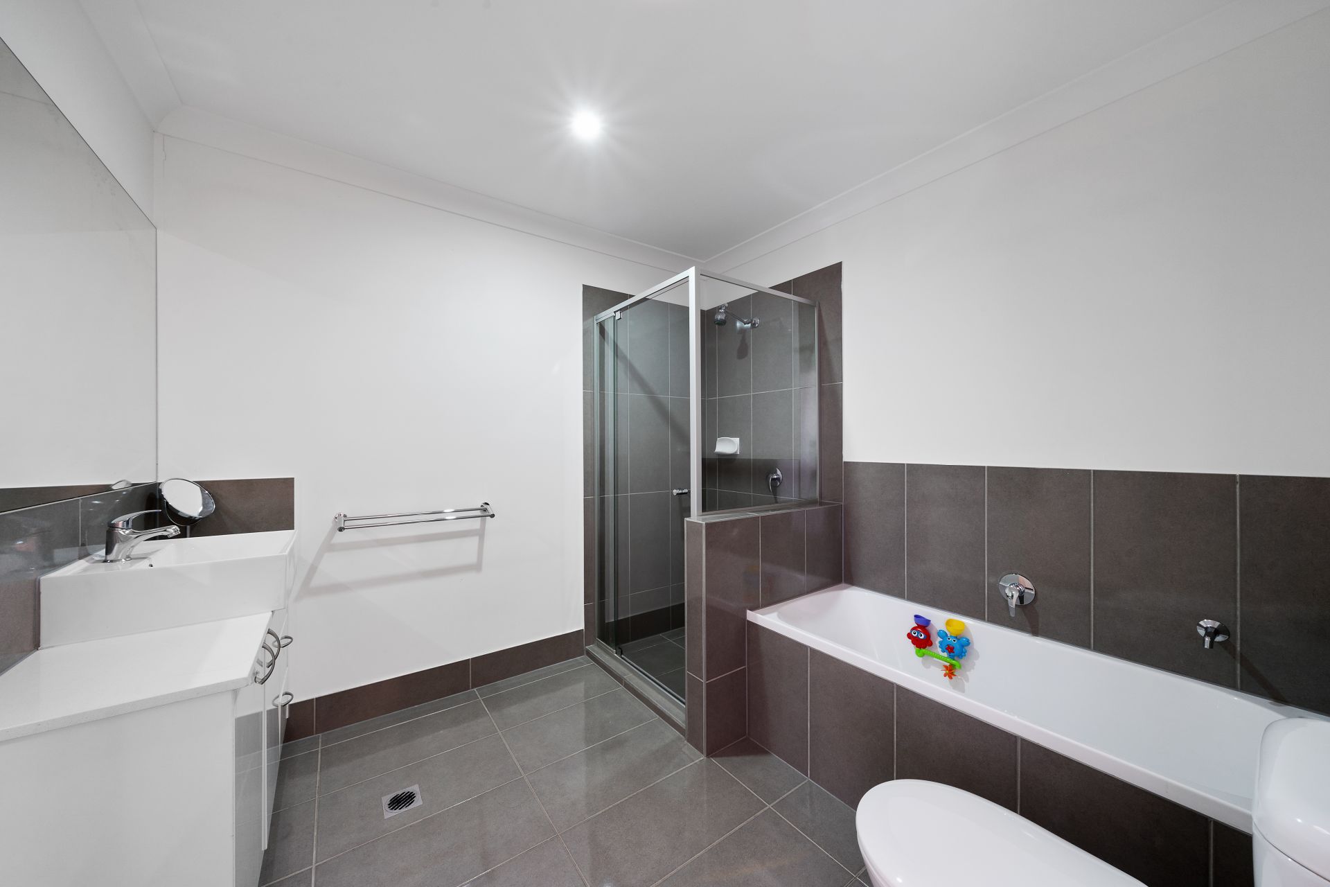 > Located on the top level of the home is the main bathroom boasting a shower with separate bath configuration, top mounted basin vanity with plenty of storage, extra-large frame-less vanity mirror, towel rack, light/extractor combo and toilet