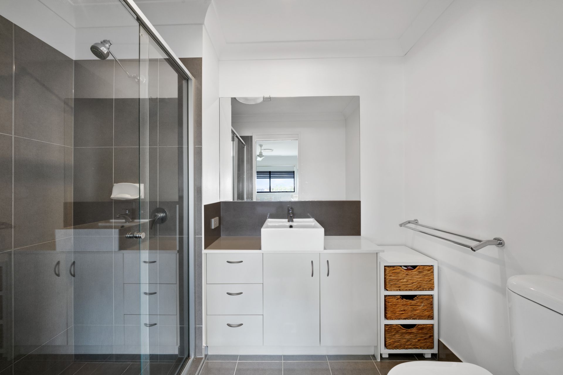 > Located on the top level of the home is the ensuite boasting a large shower top mounted basin vanity with plenty of storage, extra-large frame-less vanity mirror, towel rack, light/extractor combo and toilet