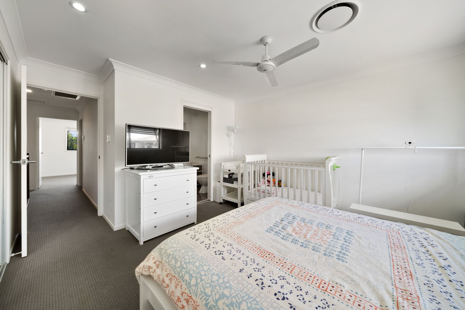 > Located on the top level of the home is the master bedroom, perfect for those who enjoy their own space boasting ensuite, ducted air-conditioning, ceiling fan, carpet flooring, mirror faced built-in-robes and modern sliding windows with roller blinds and down-lighting