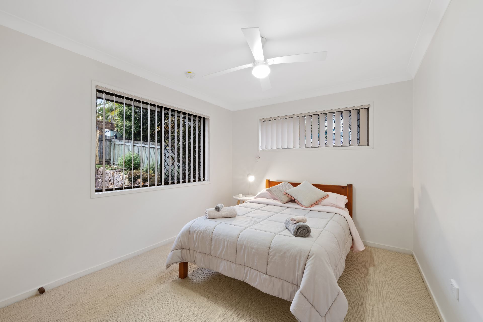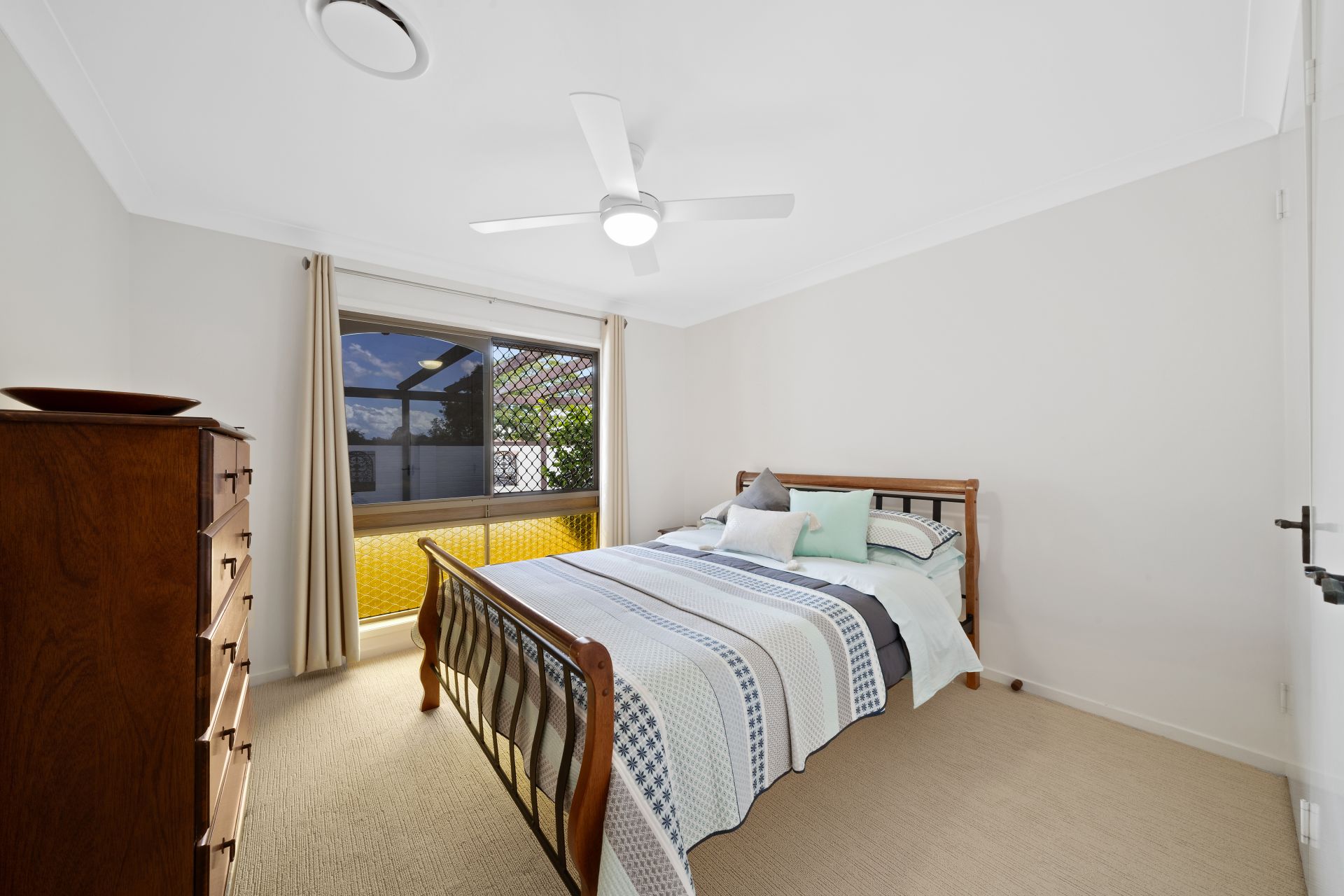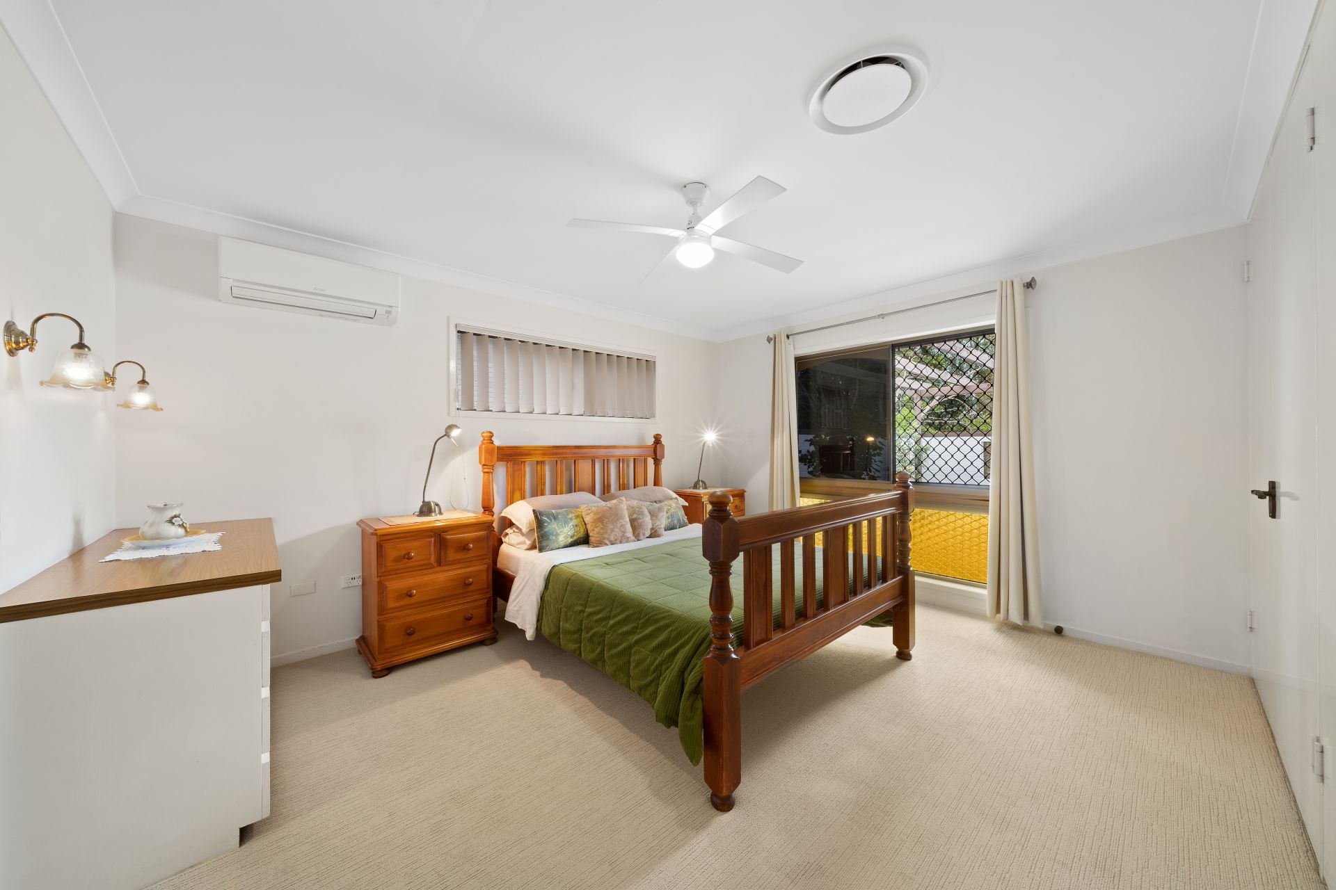> Bedroom 3 offers air-conditioning, plush carpet flooring, built-in robe, tinted sliding windows, security screens, vertical blinds and ceiling fan with light