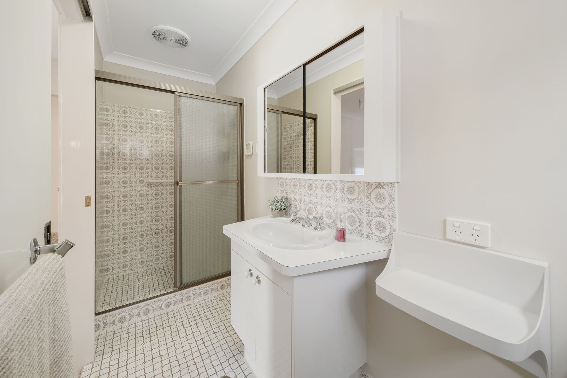 > The ensuite bathroom offers, single basin vanity with plenty of storage, mirror faced medicine cabinet, separate shower, towel rack, hand towel rack, shelf, grab rail, light, extractor and toilet