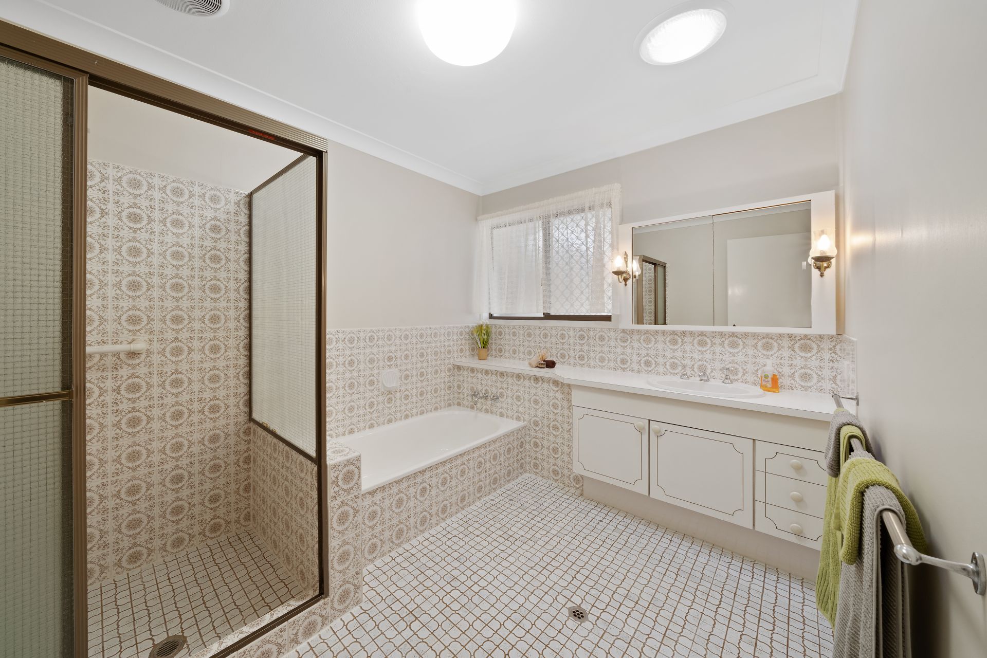 > The main bathroom offers single basin vanity with plenty of storage, mirror faced medicine cabinet, shower with separate bathtub configuration, towel racks, grab rail, light, extractor, skylight and separate toilet