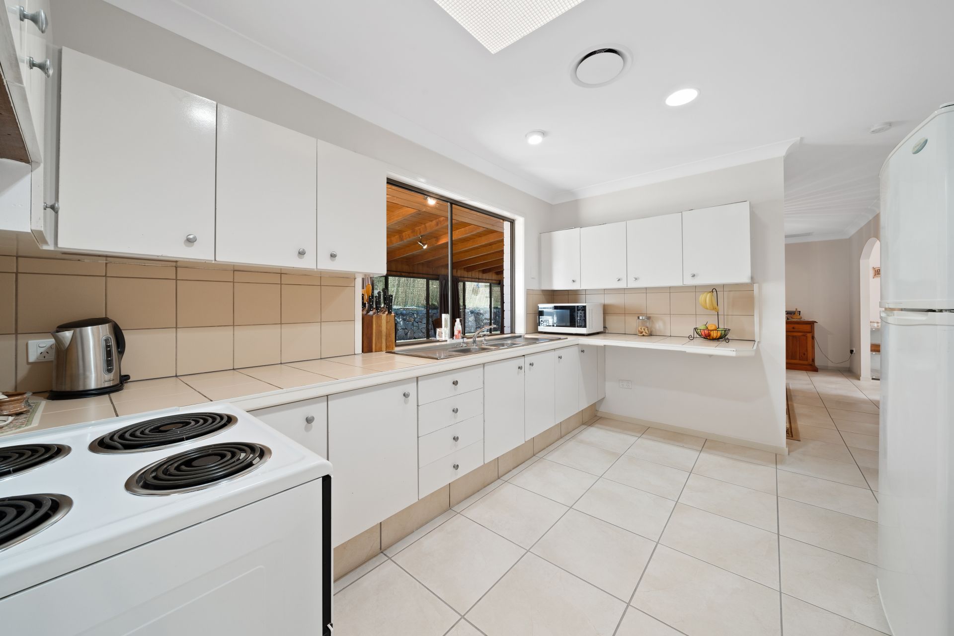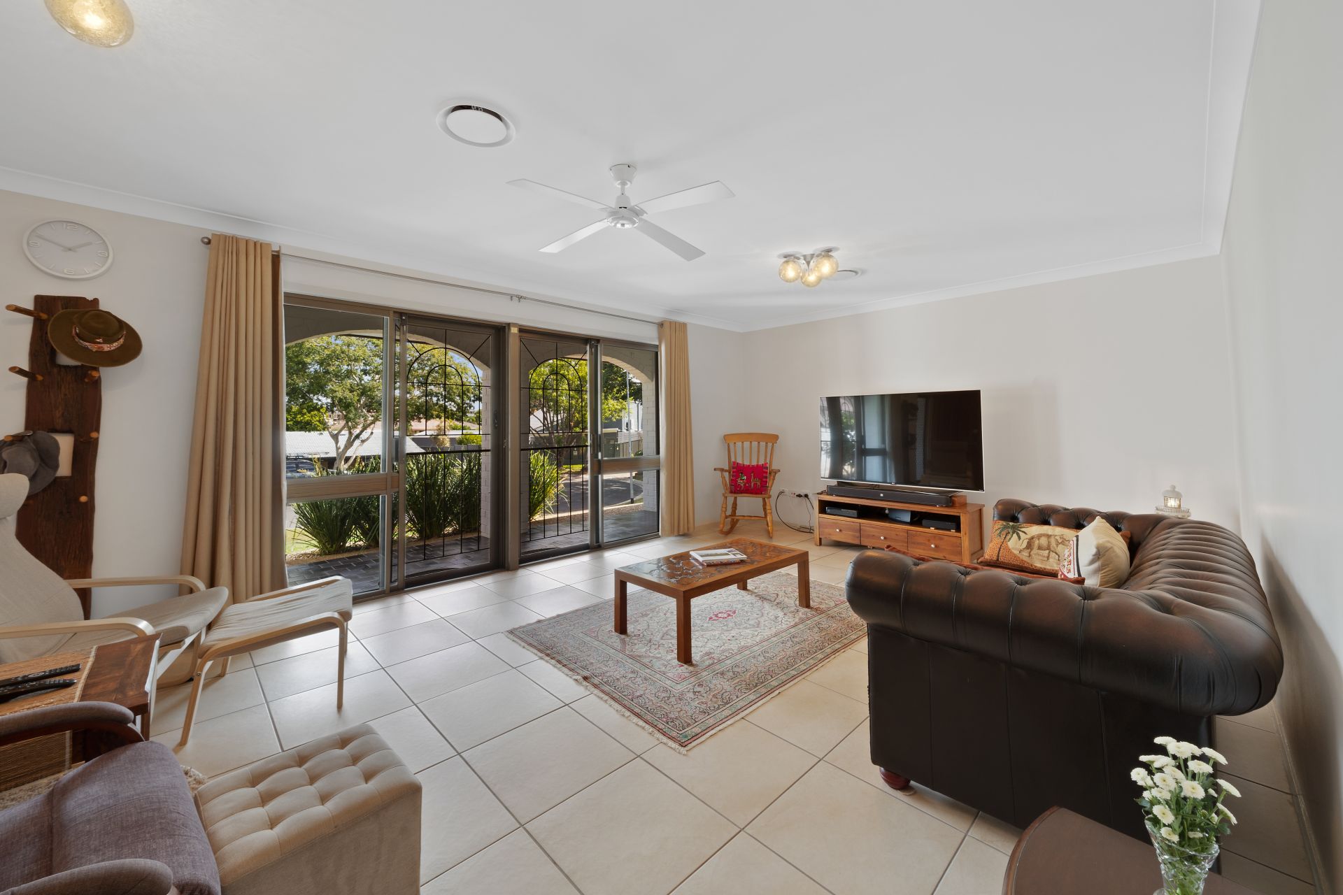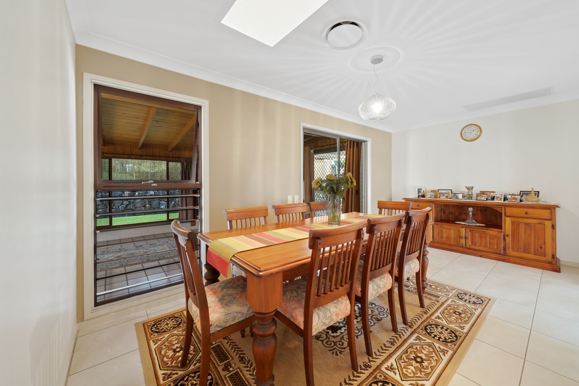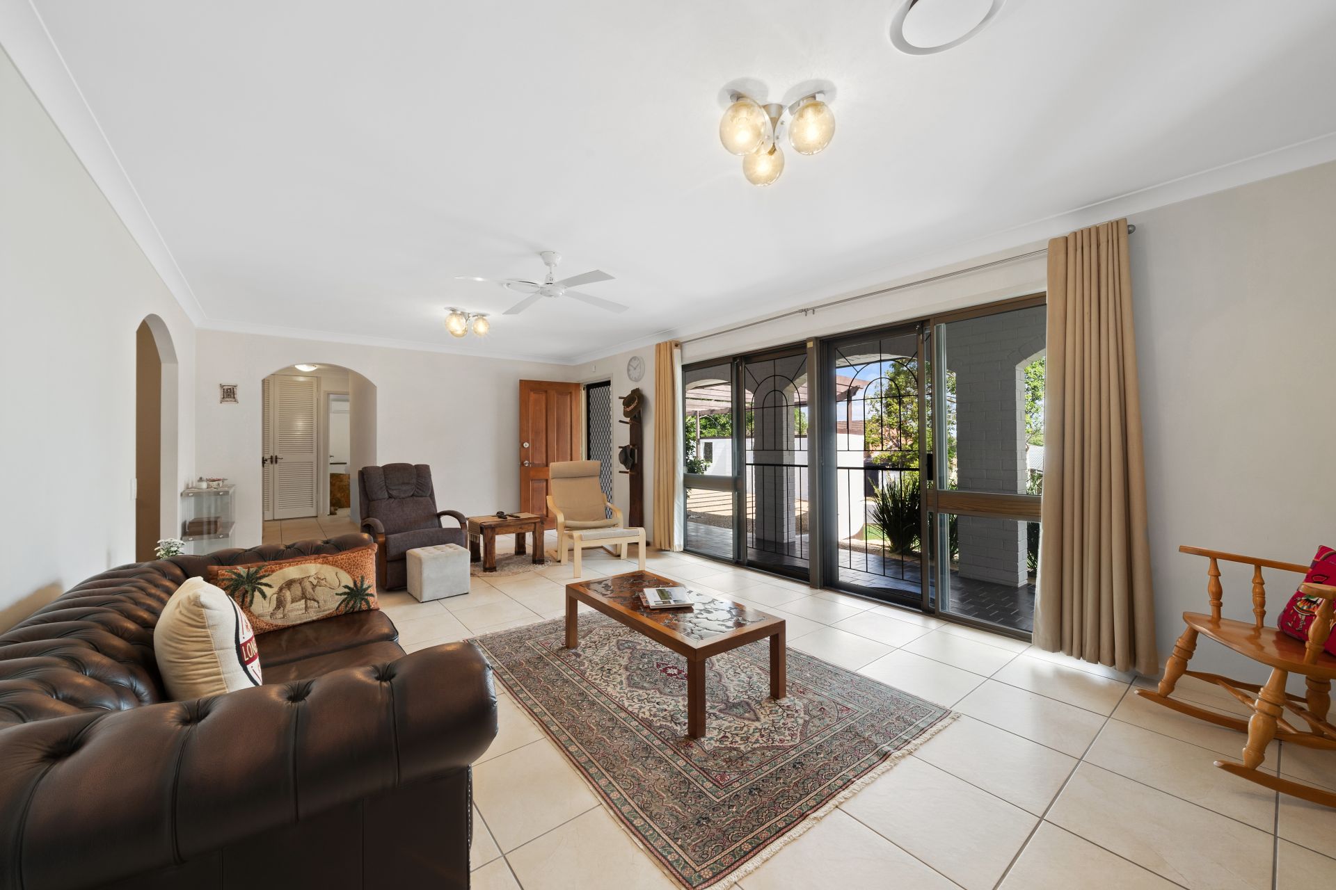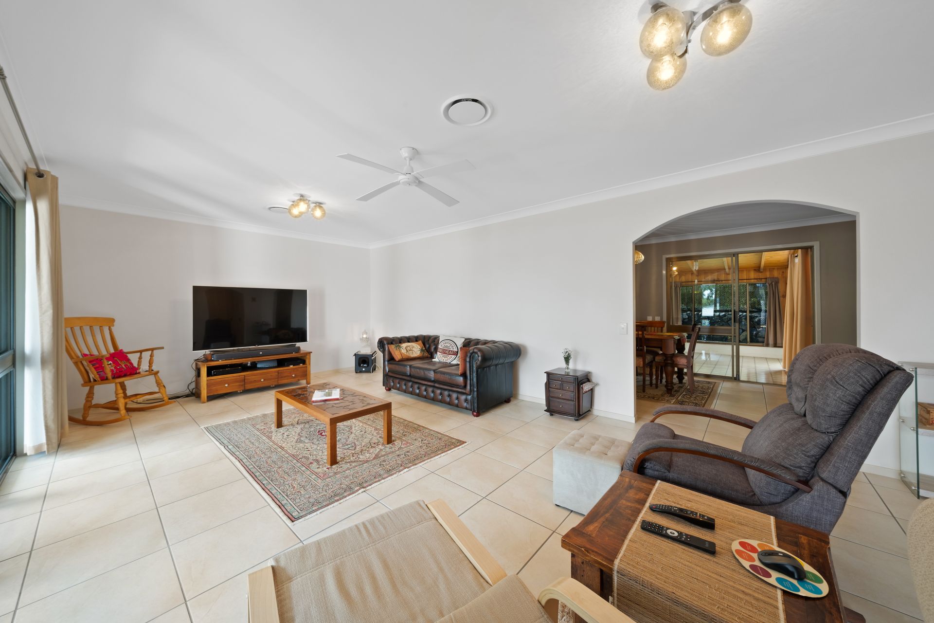 > The lounge/dining/rumpus areas flow effortlessly to the kitchen and out to the outdoor entertaining areas. Featuring air-conditioning, tiled flooring, large sliding glass doors, security screens, curtains, pendant lighting and ceiling fan