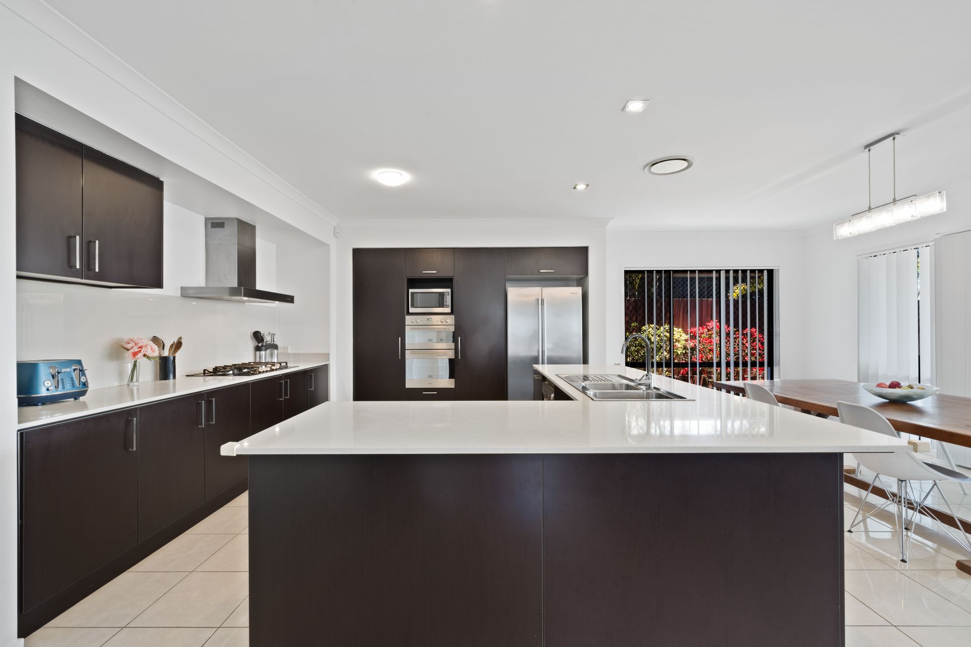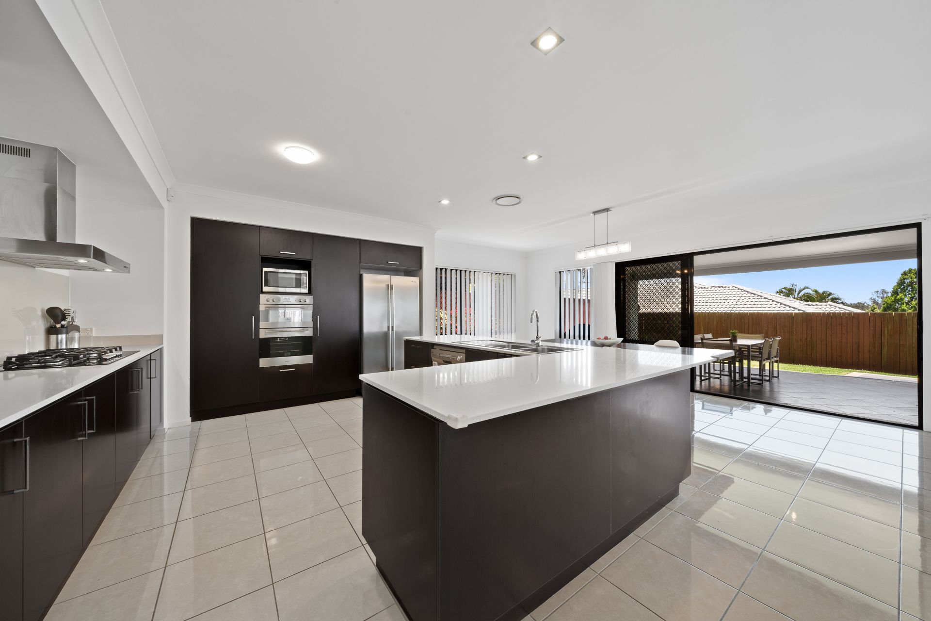 The huge, centrally located kitchen shares an open plan with the home's main living and meals area with visibility out to the outdoor entertaining area and back yard. It features: