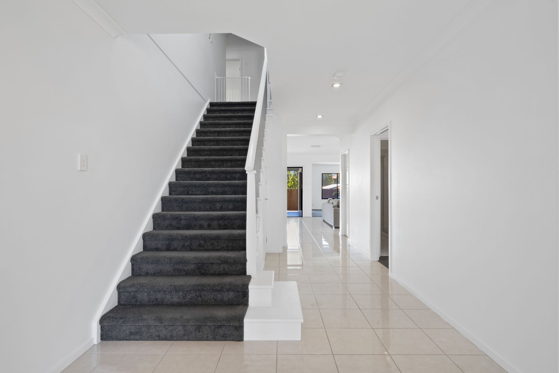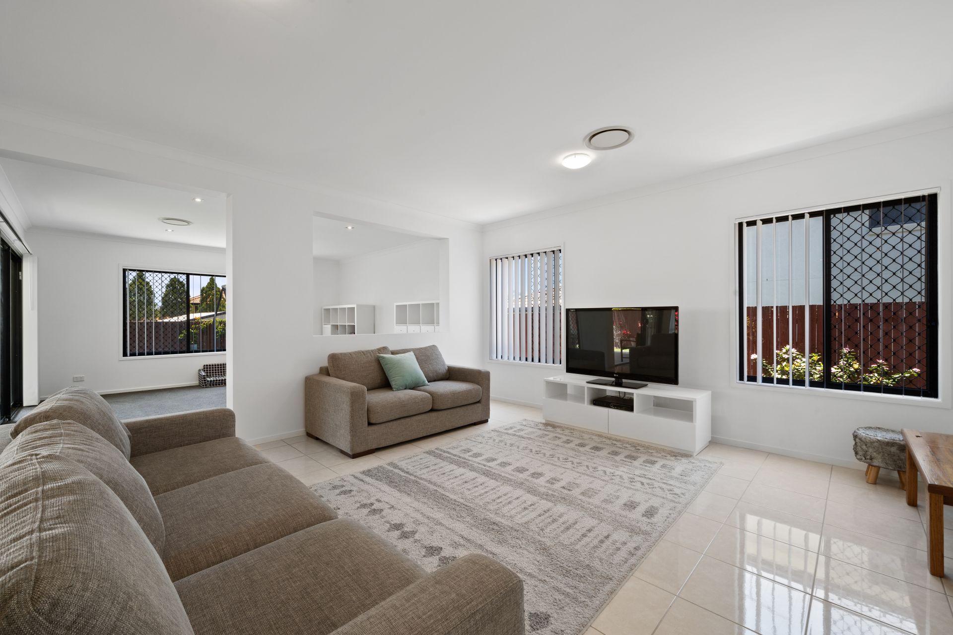 - Living room is located upstairs, providing a large separate living space for the kids to occupy or as a quiet escape. Features include carpeted flooring, ducted air-conditioning, security screens and plantation shutters.