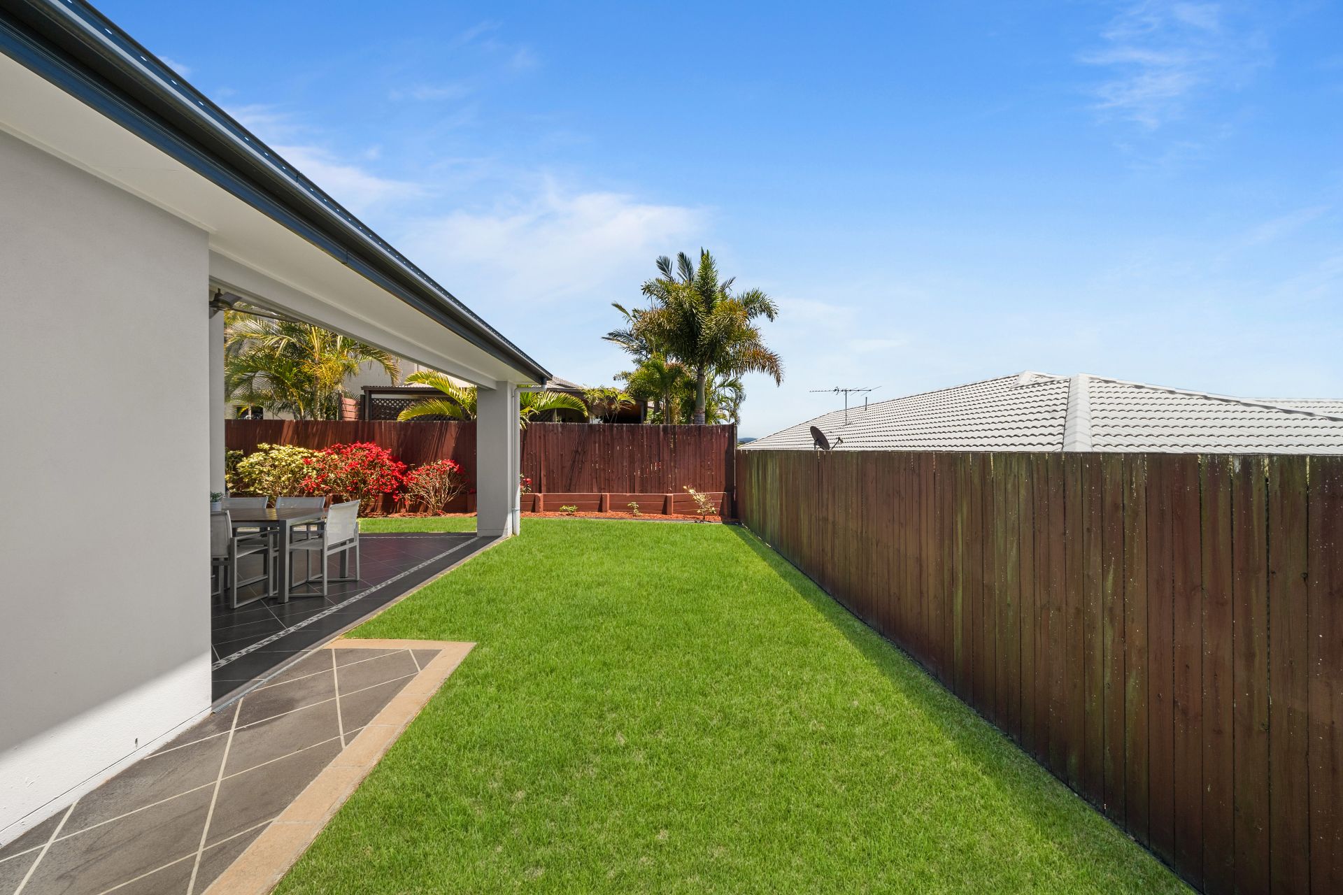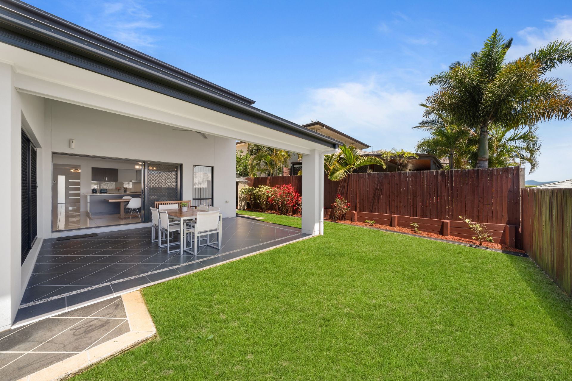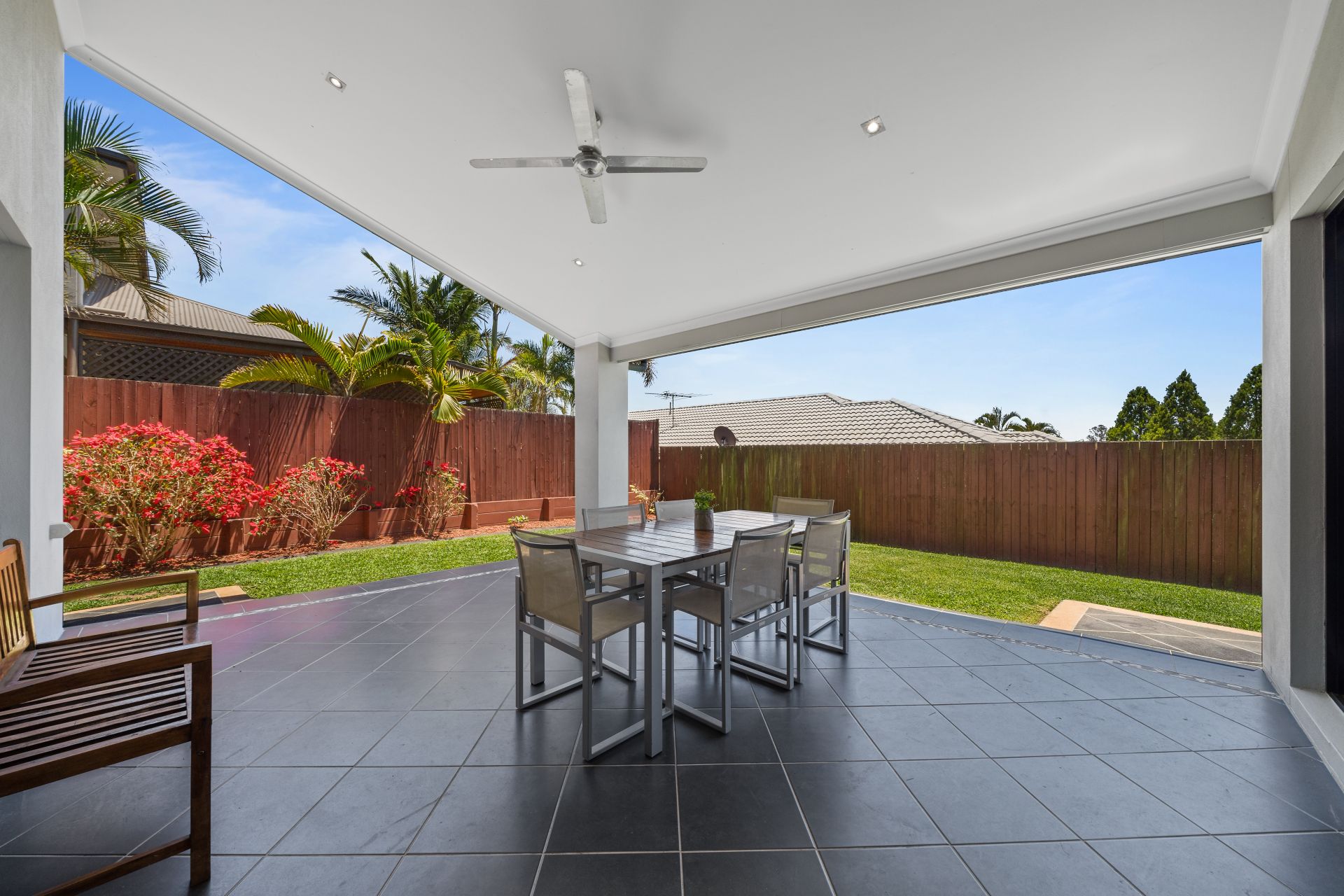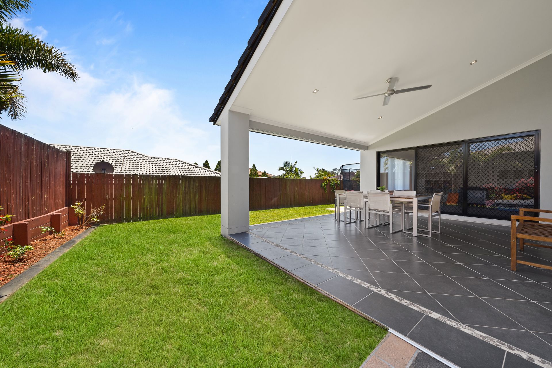 - Outdoor entertaining is available in spades. Overlooking the level, fully fenced back yard, the private covered entertaining area off the home's family and rumpus rooms provides the perfect place to sit and unwind while watching the kids play.