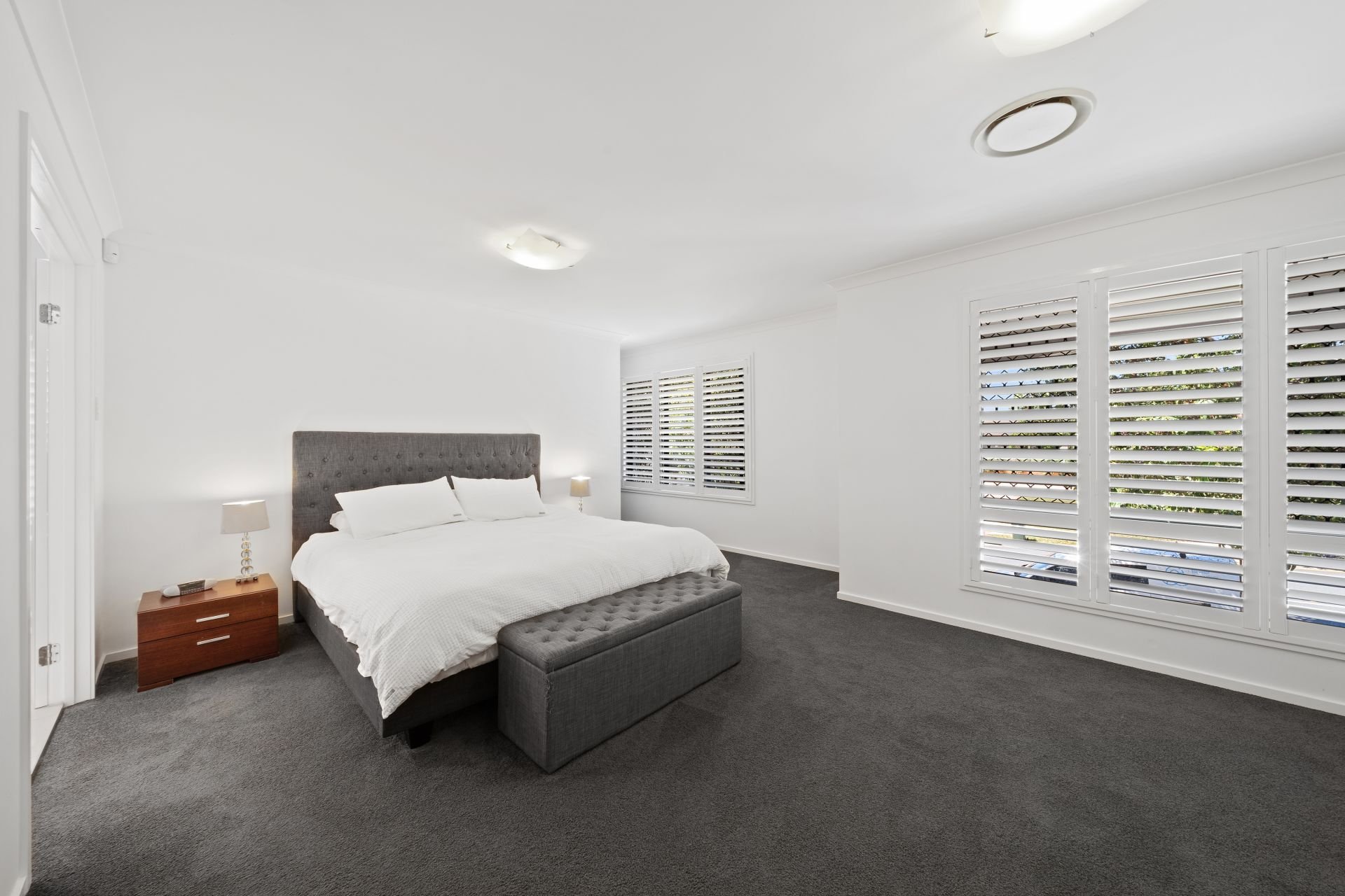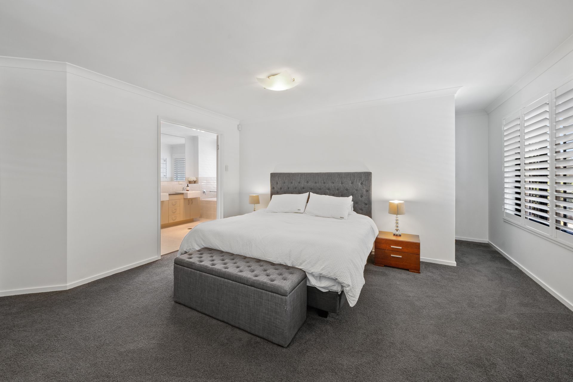 - Bedroom one is the home's spacious master bedroom. With beautiful views from its elevated position, it features large ensuite, carpeted flooring, ducted air-conditioning, walk-in-robe and plantation shutters.