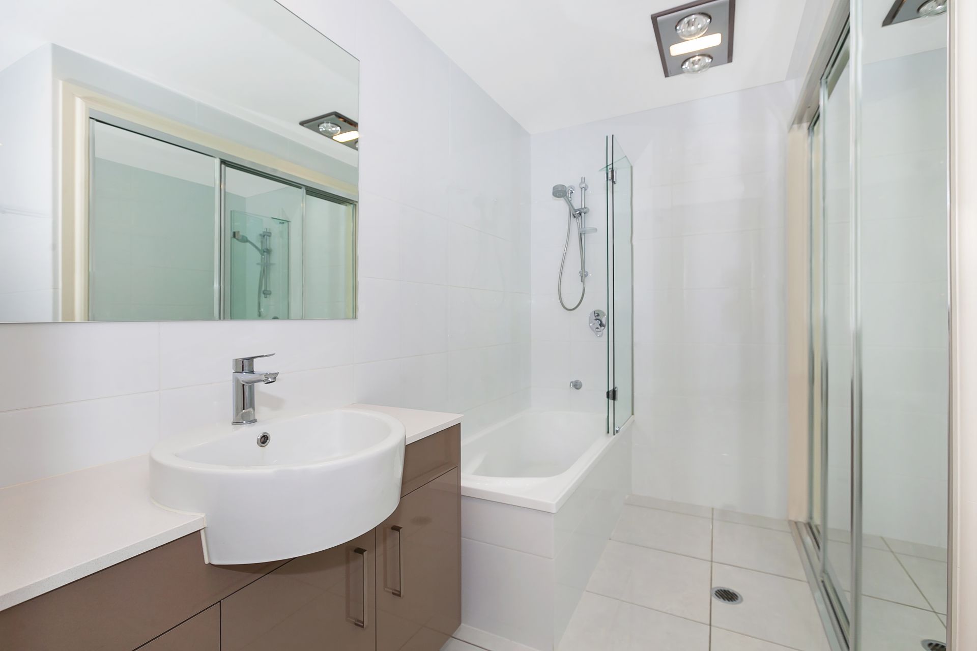> The main bathroom offers both combined shower and bath, stone benches, exhaust fan with heat lamps, seamless vanity mirror plus compact laundry behind mirrored doors