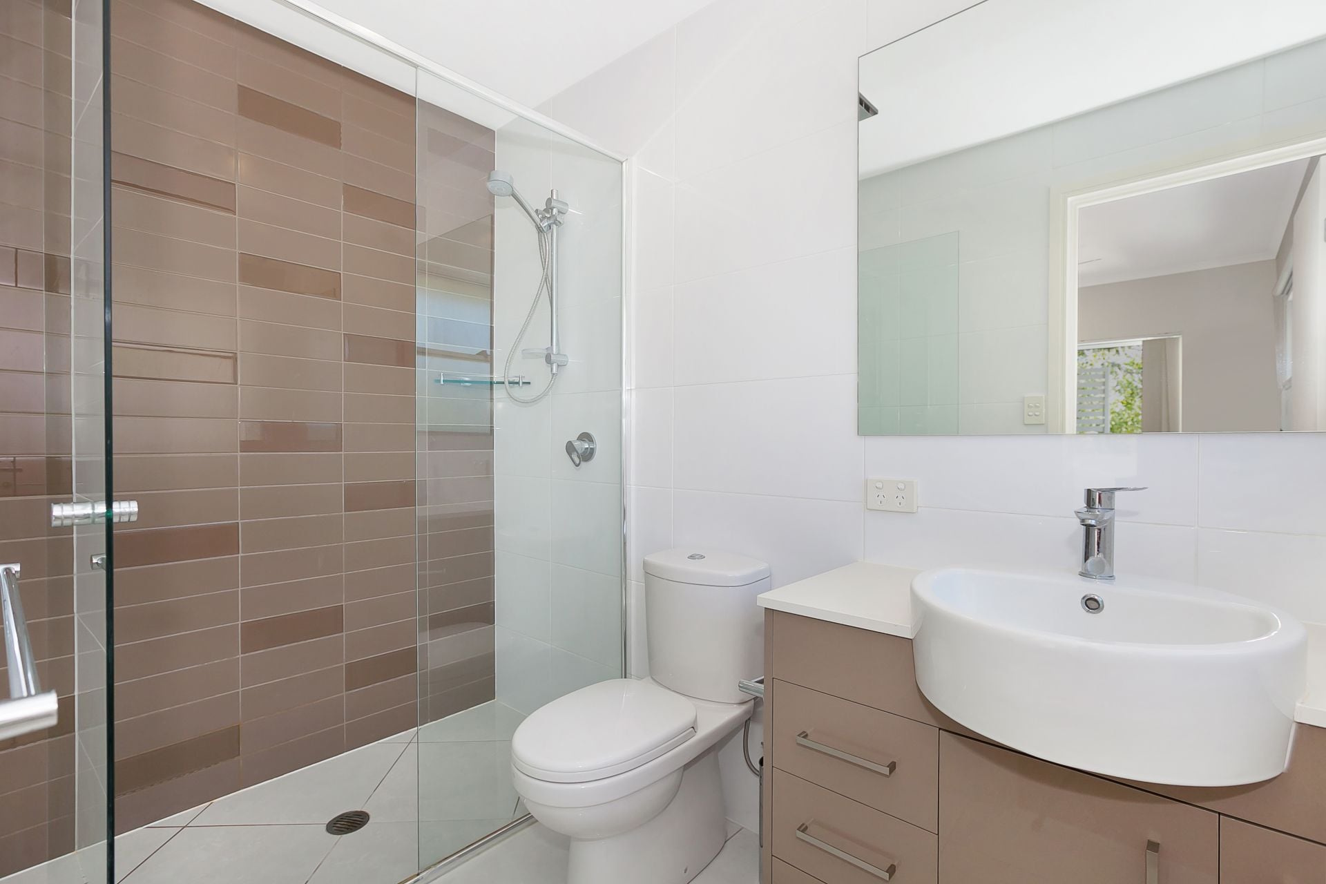 > Ensuite with glass and chrome shower, modern vanity with stone benchtop