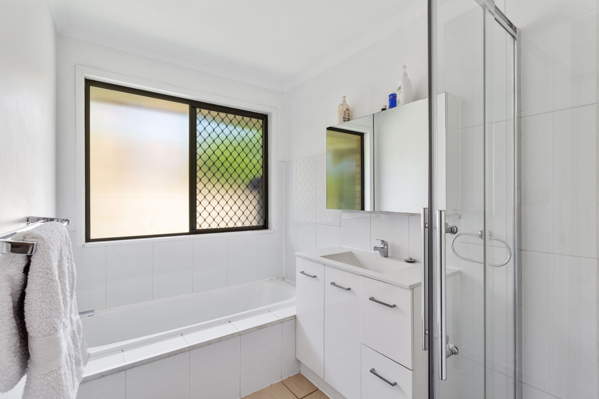 > The main bathroom features floor tiles, framed walk-through shower with separate freestanding bath configuration, stainless steel shower head, single basin, large vanity mirror, exhaust fan and frosted windows.