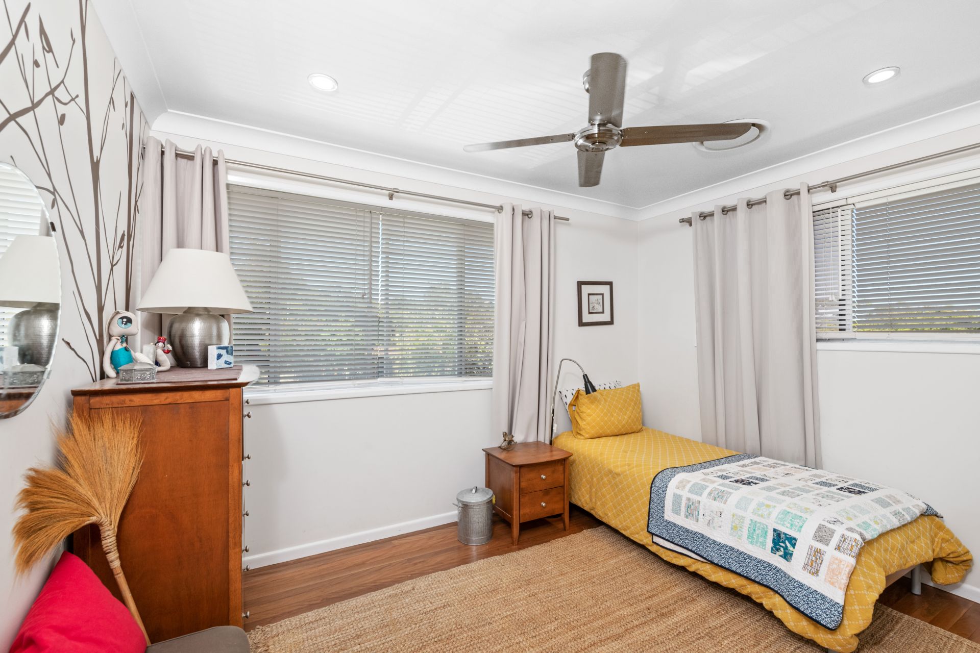 - Bedroom three features polished timber flooring, ducted air-conditioning and stainless-steel ceiling fan.