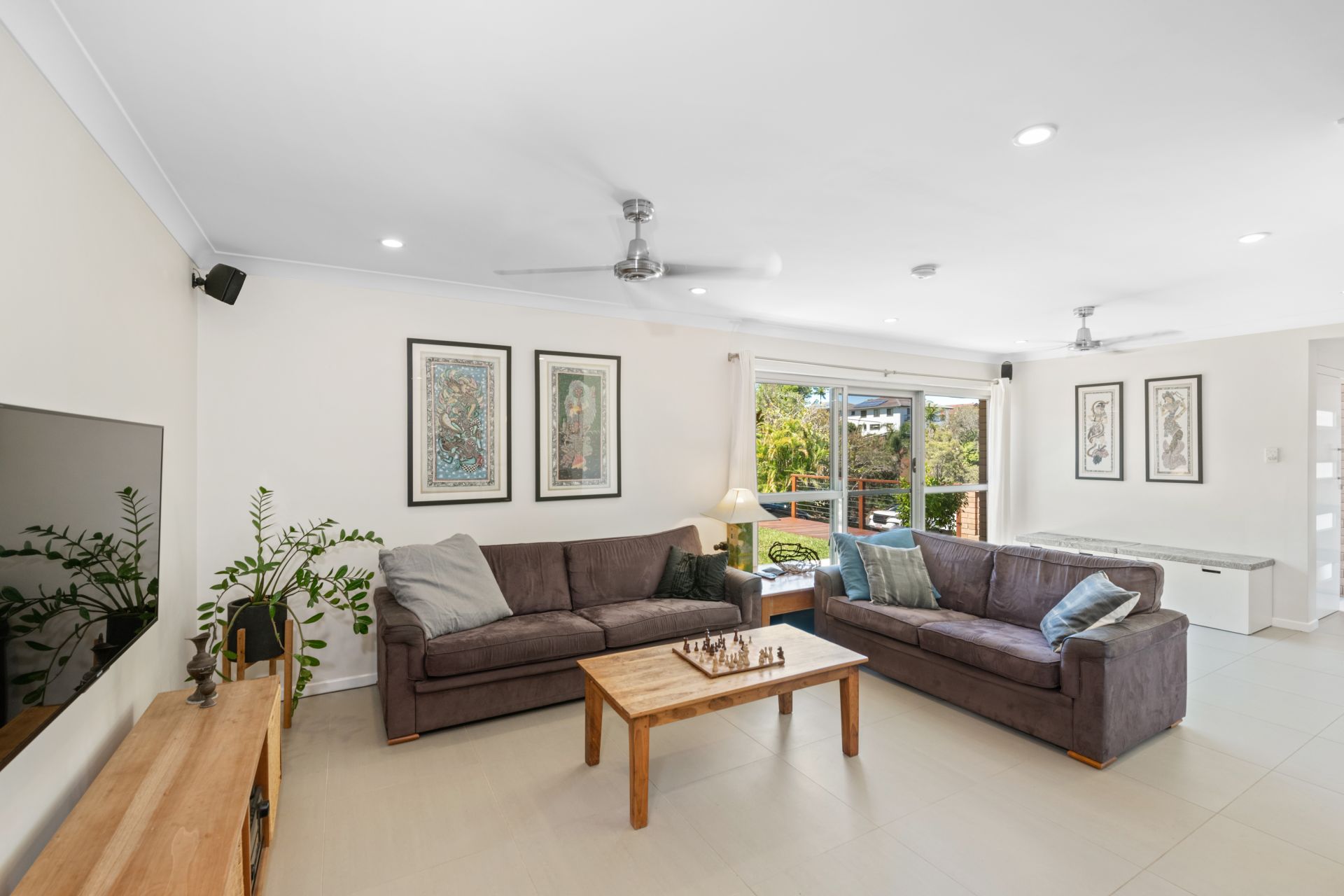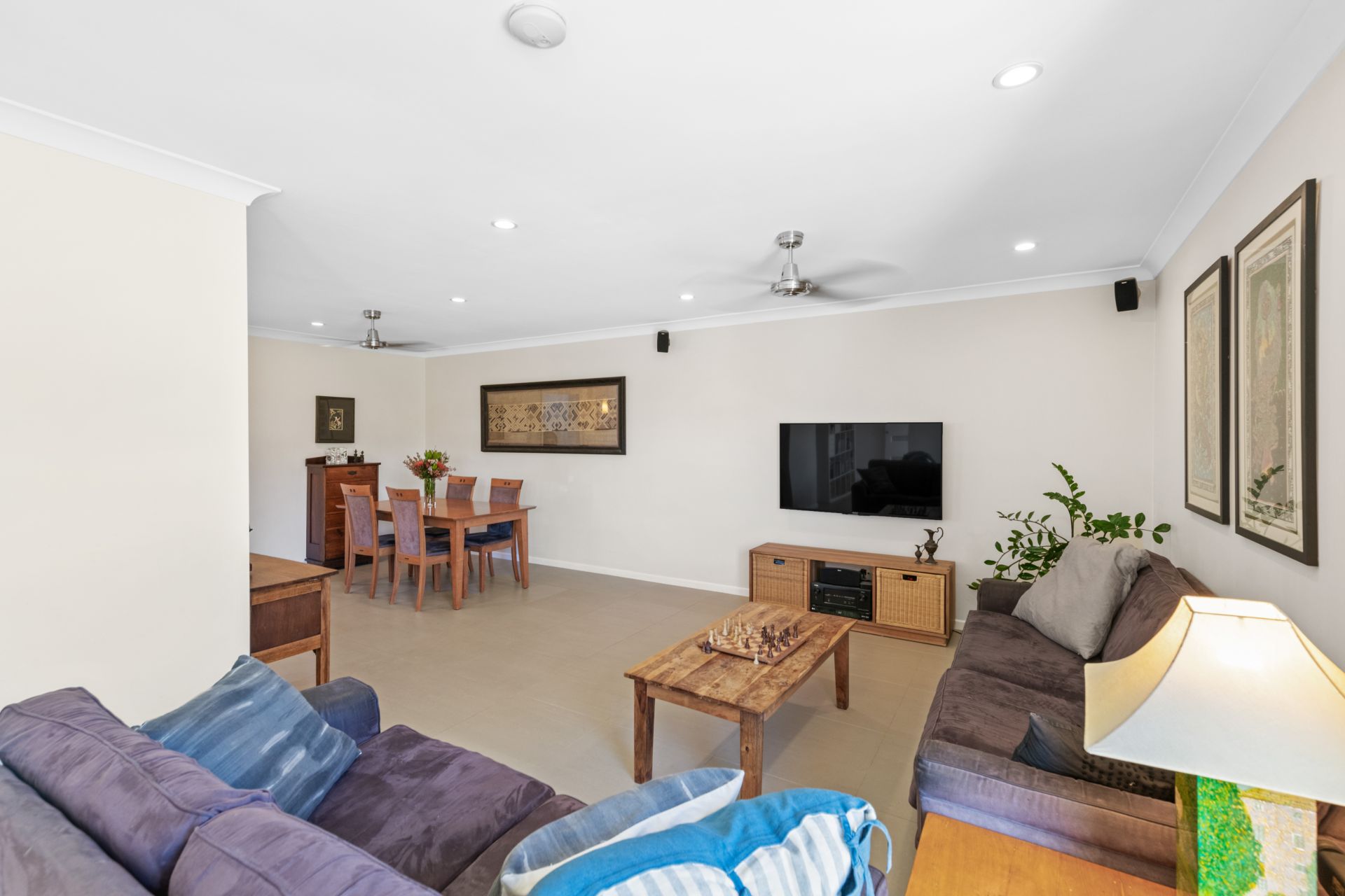 - Lounge and dining rooms share a large open space at the front of the home. This versatile room features tiled flooring, stainless ceiling fans and access to the front yard via sliding glass door and security mesh door for added security.