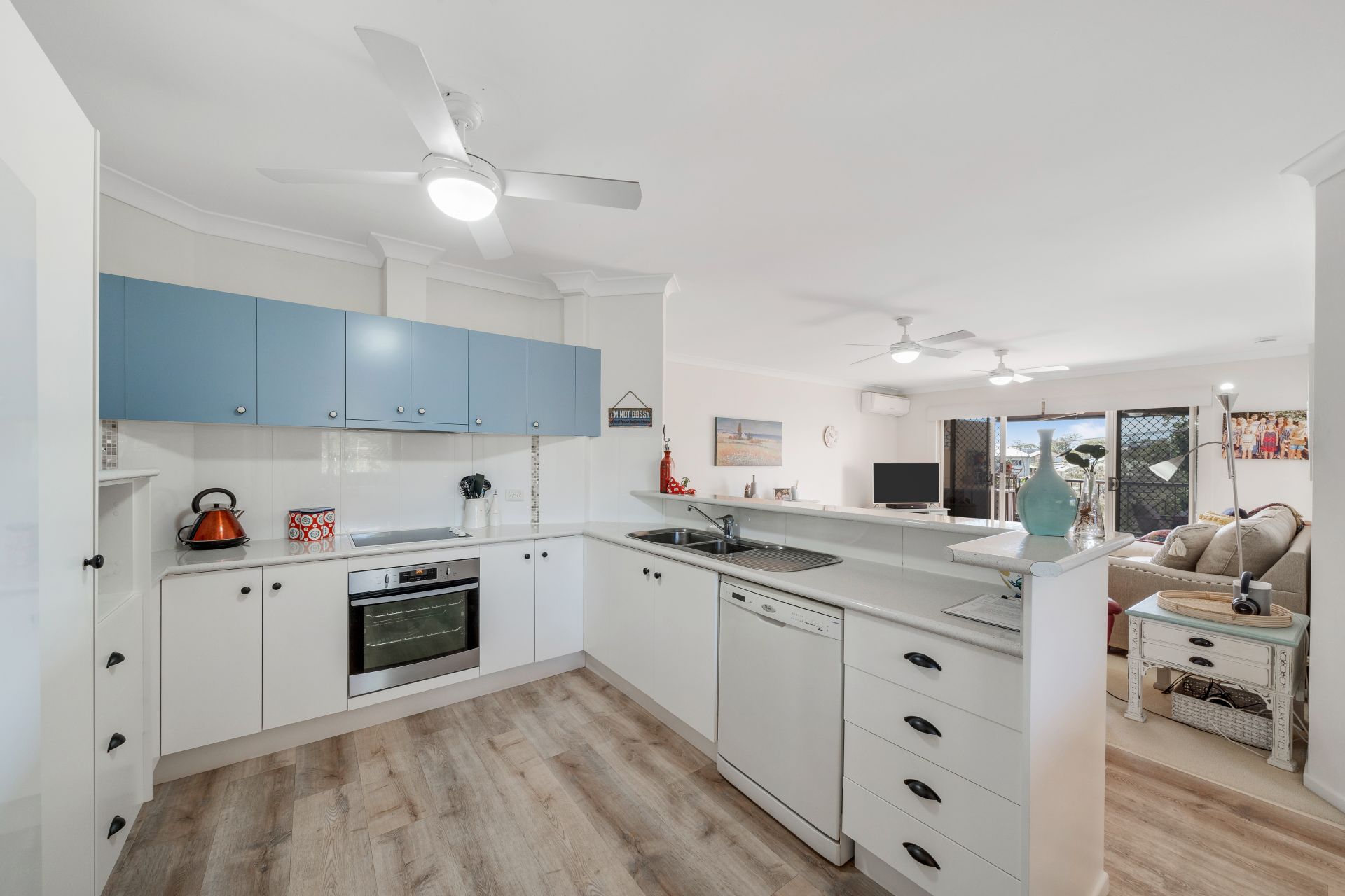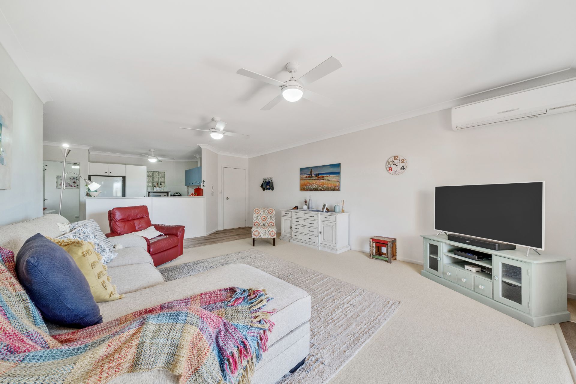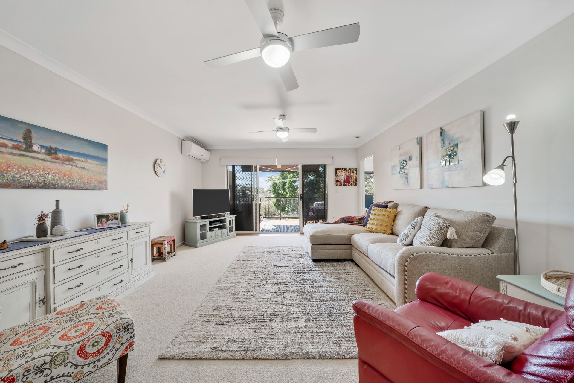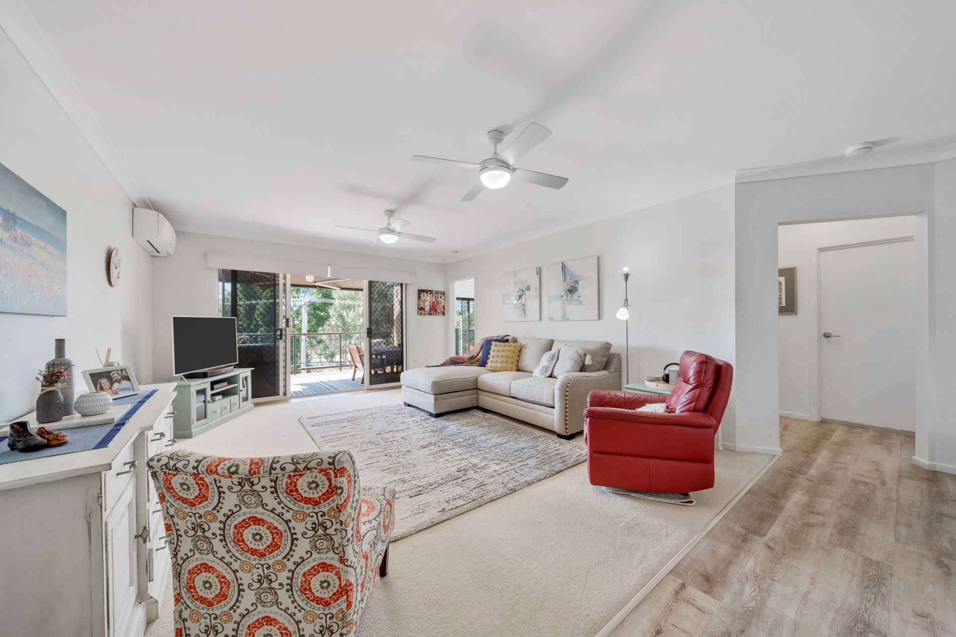 > The combined lounge/dining area located at the heart of this property features Mitsubishi split-system air-conditioning, a combination of carpet + durable wood-look flooring, roller blinds, triple ceiling fans, sliding doors with security screens, and access to the large entertaining balcony offering a seamless flow of living space