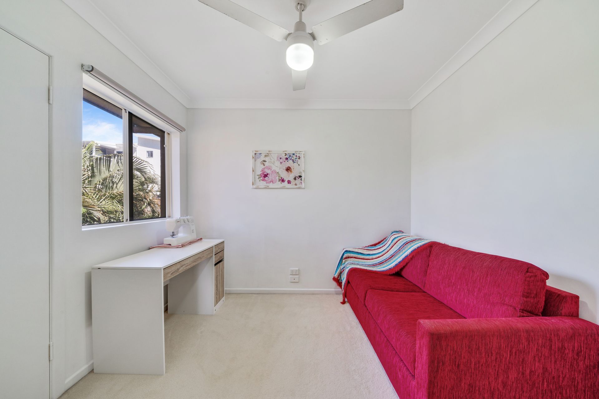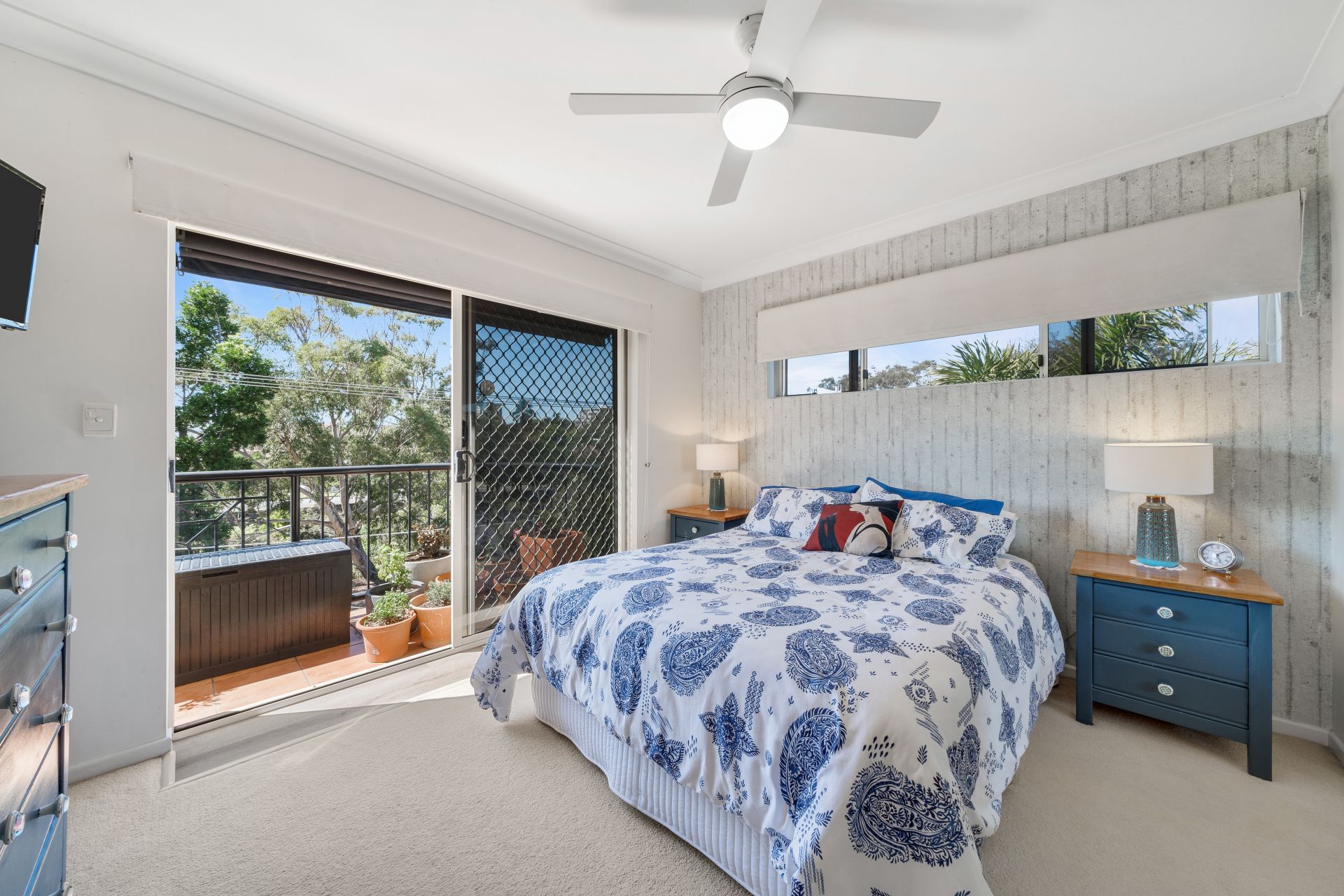 > The second bedroom features carpet flooring, roller blinds, ceiling fan, sliding windows with security screens, and a built-in robe