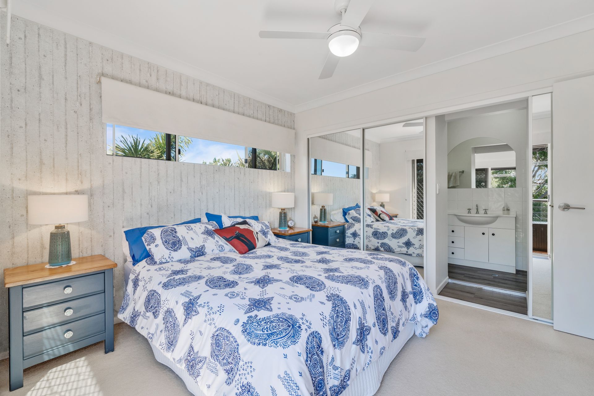 > The master bedroom features carpet flooring, roller blinds, ceiling fan, sliding windows with security screens, built-in robes, ensuite, and access to the front balcony