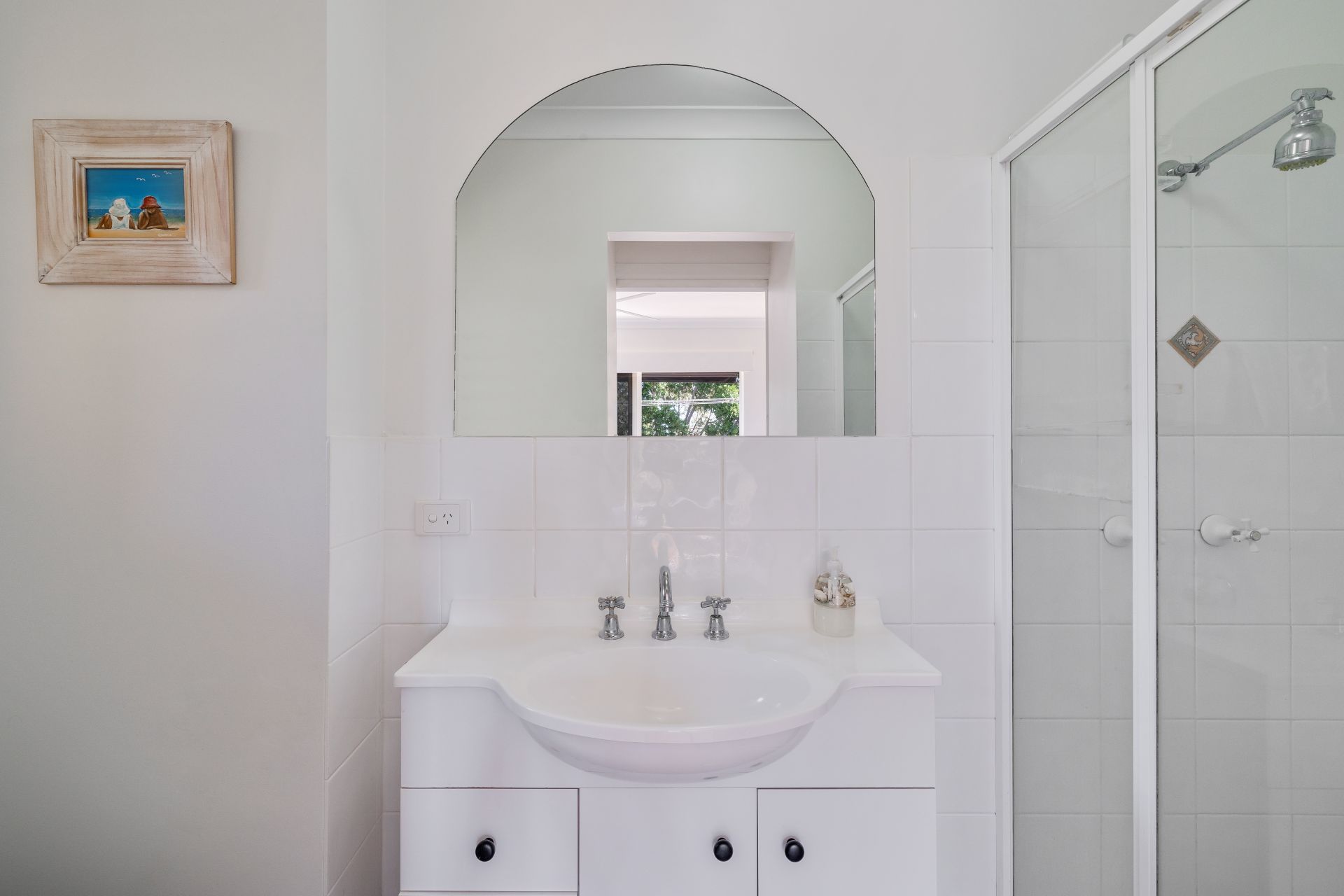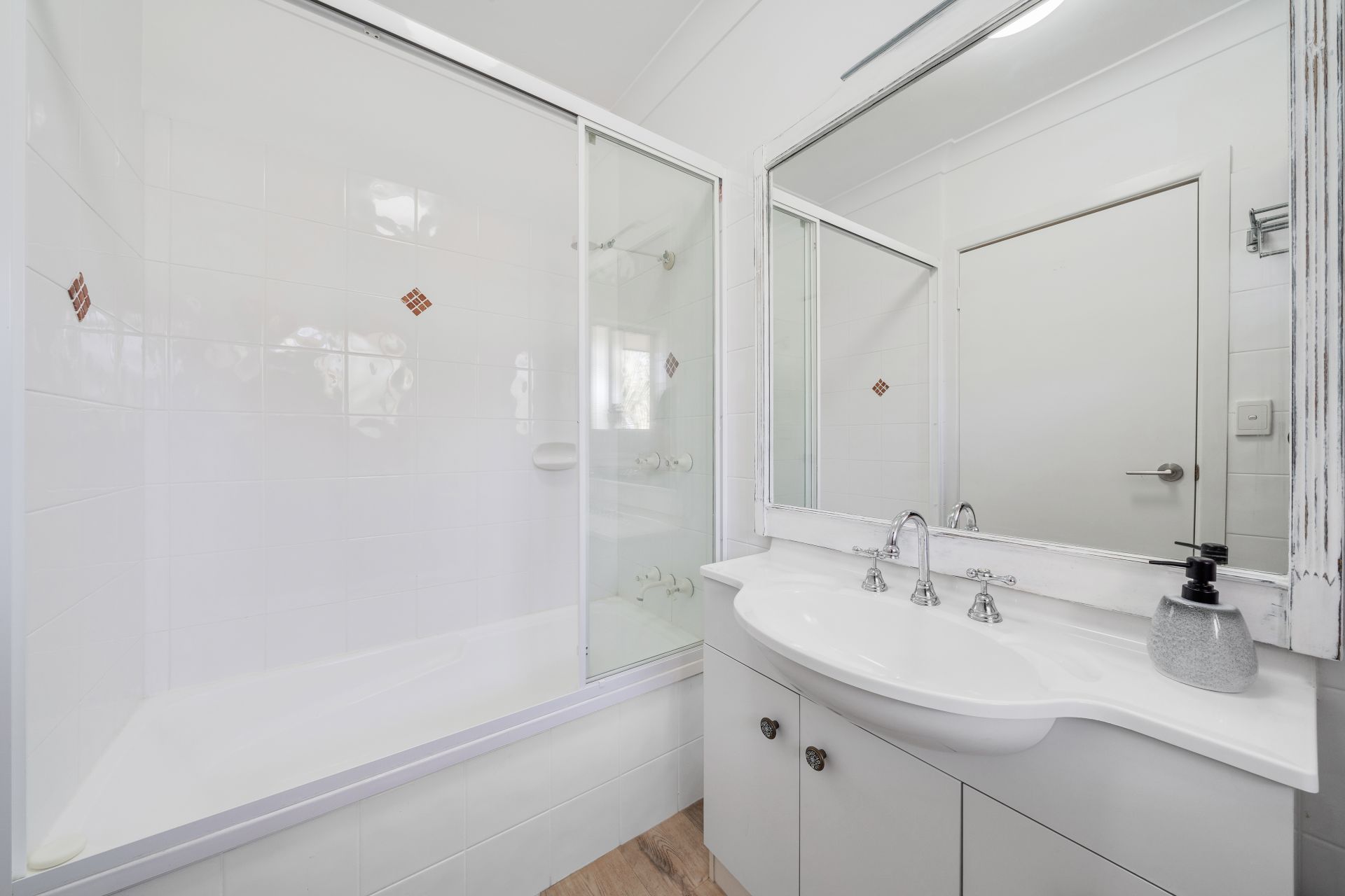 > The European main bathroom features a single cast basin, vanity with plenty of storage, framed vanity mirror, towel rail, shower-over bath configuration, and separate toilet