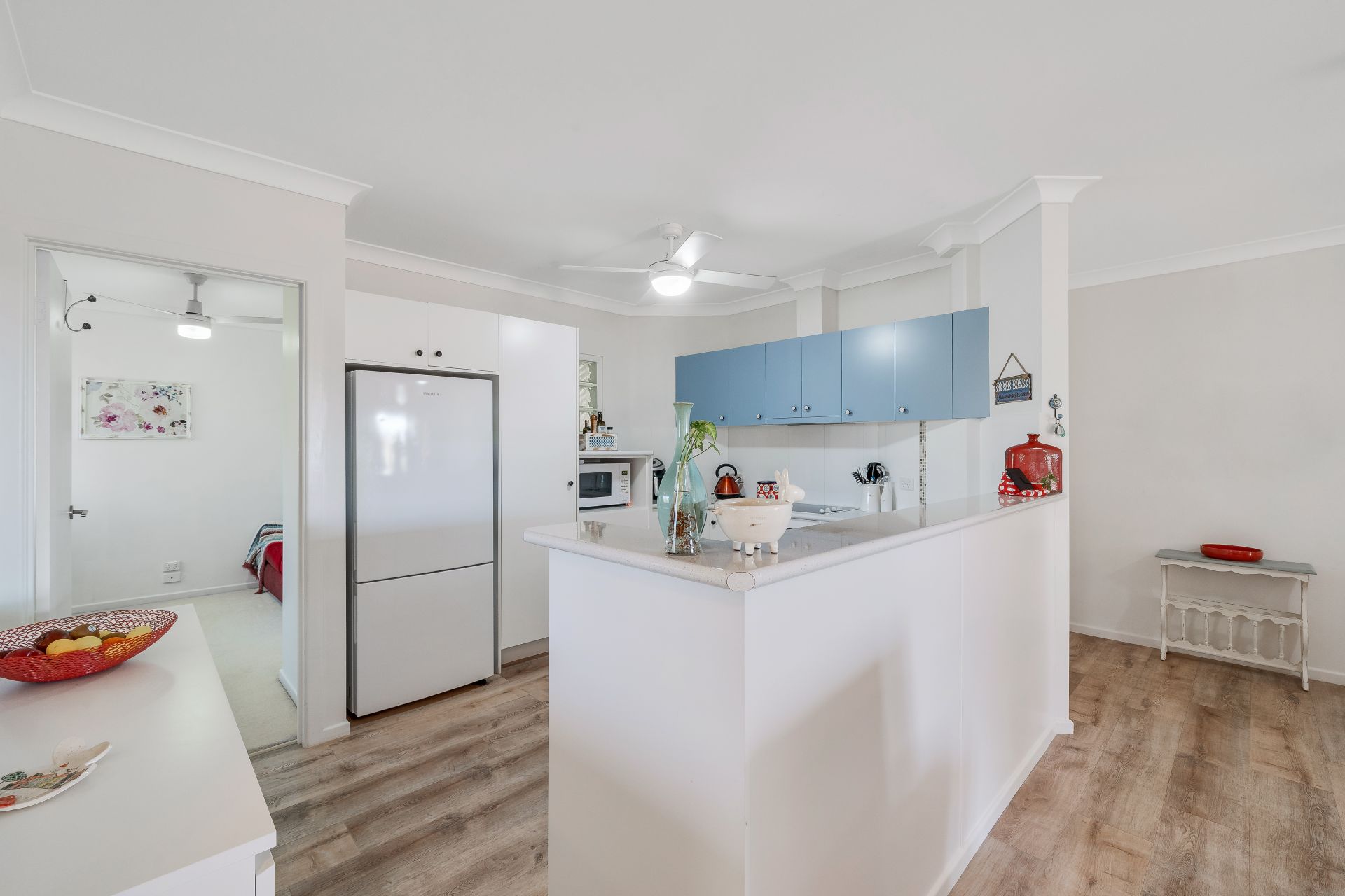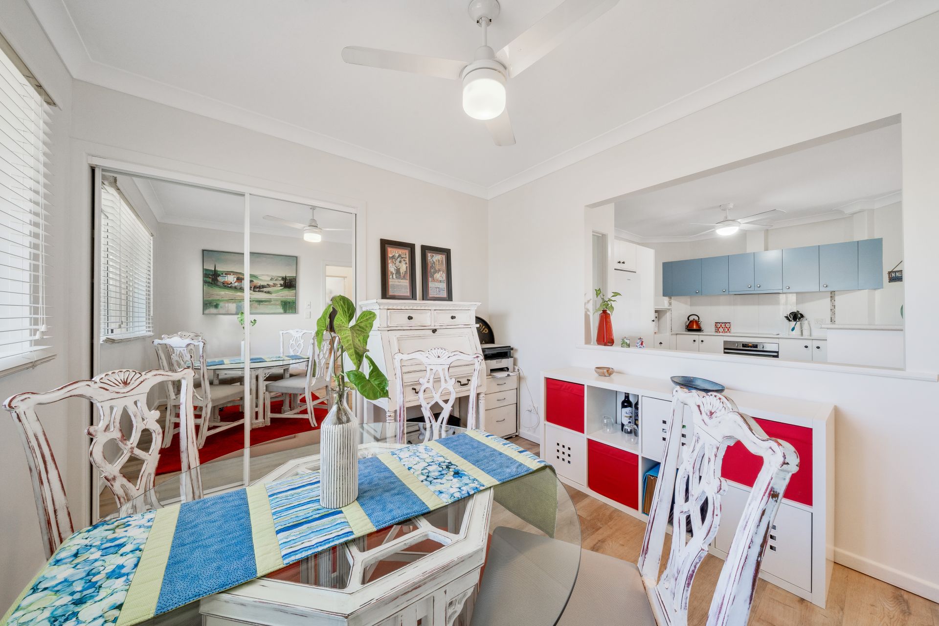 > The third bedroom currently being used as the dining room features durable wood-look flooring, Venetian blind, ceiling fan, sliding windows with security screens, and built-in robe