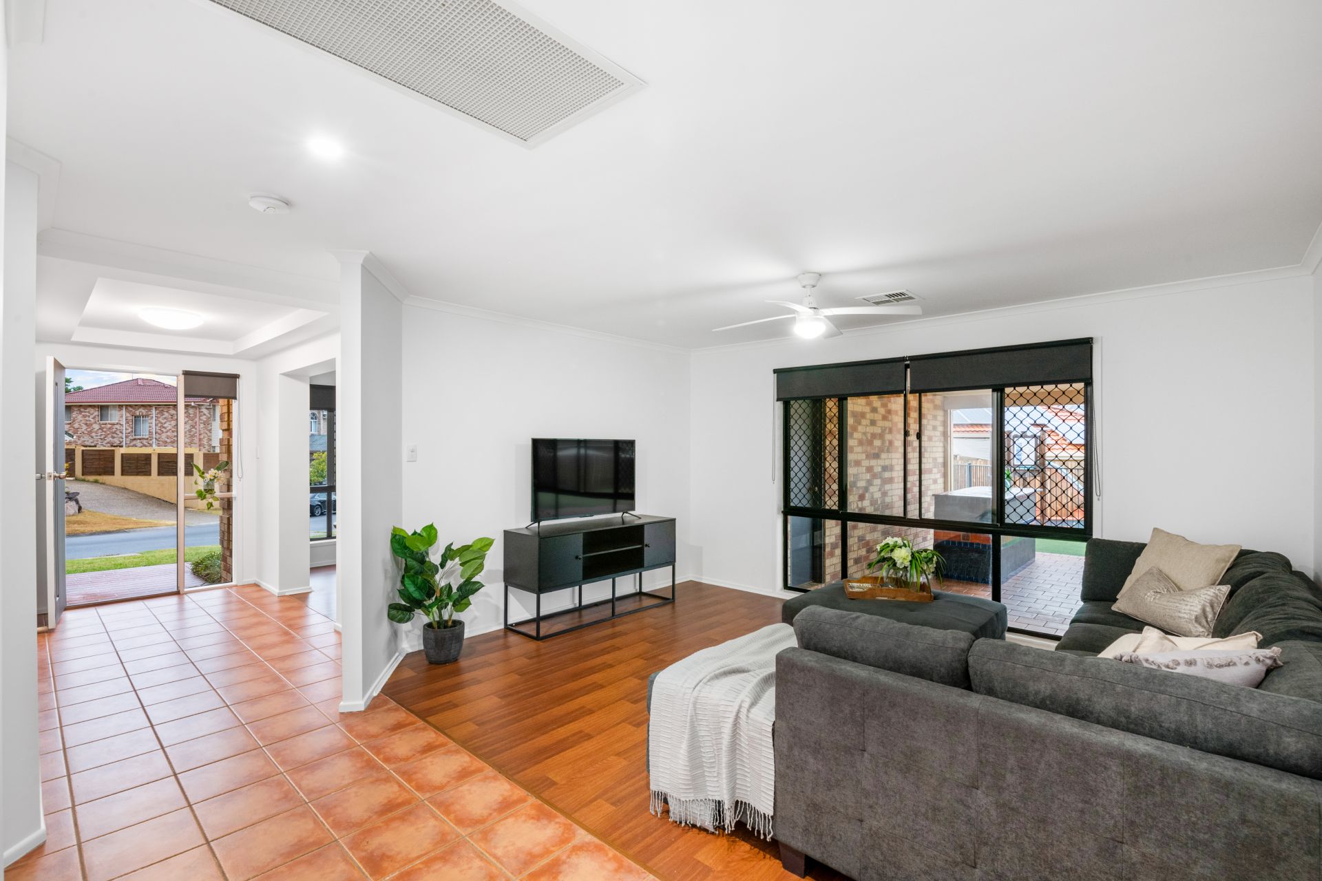 - Loungeroom is separate from the home's other living area and overlooks the outdoor entertaining area. It features timber-look flooring, ducted air-conditioning, ceiling fan and roll-down blinds.