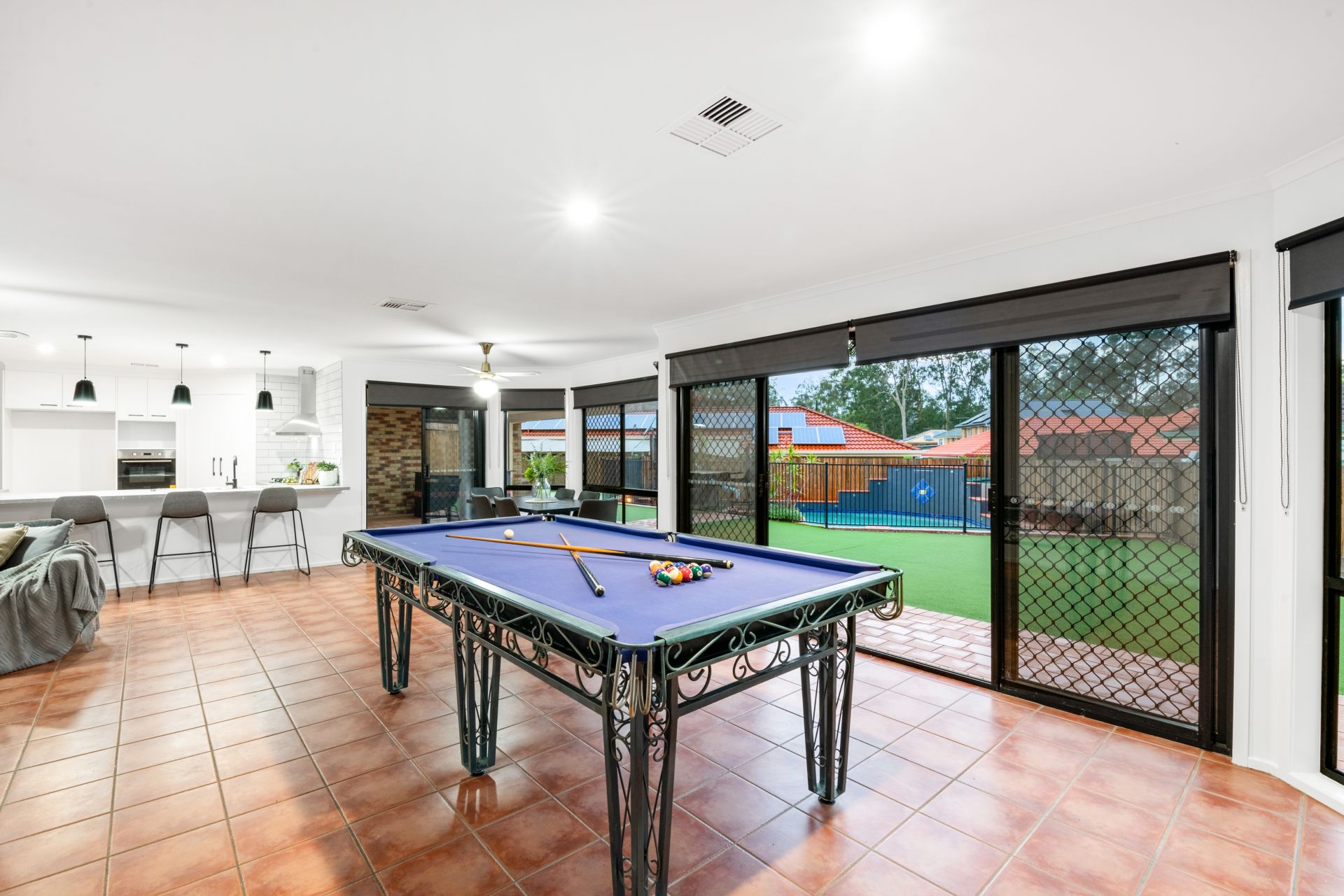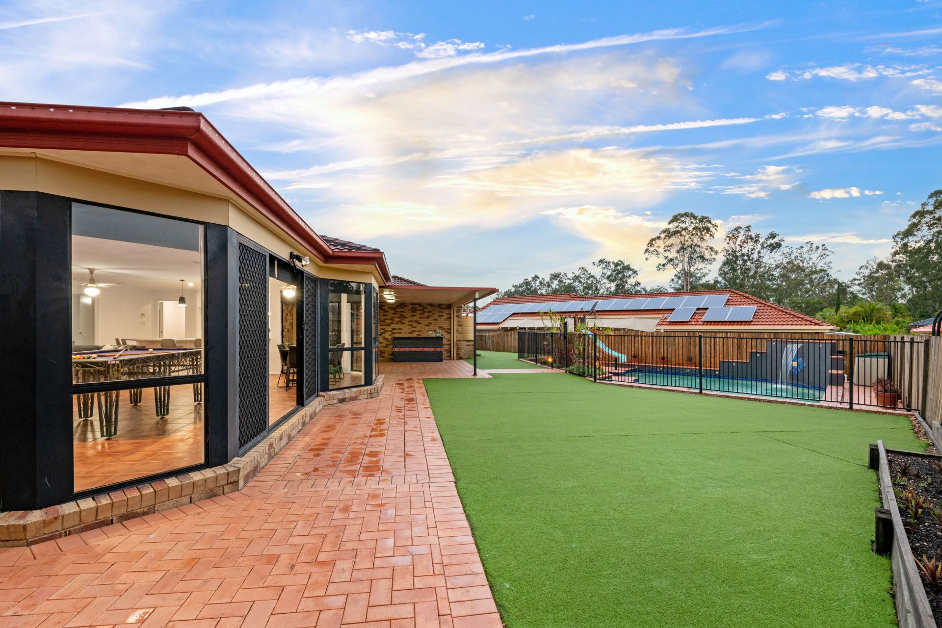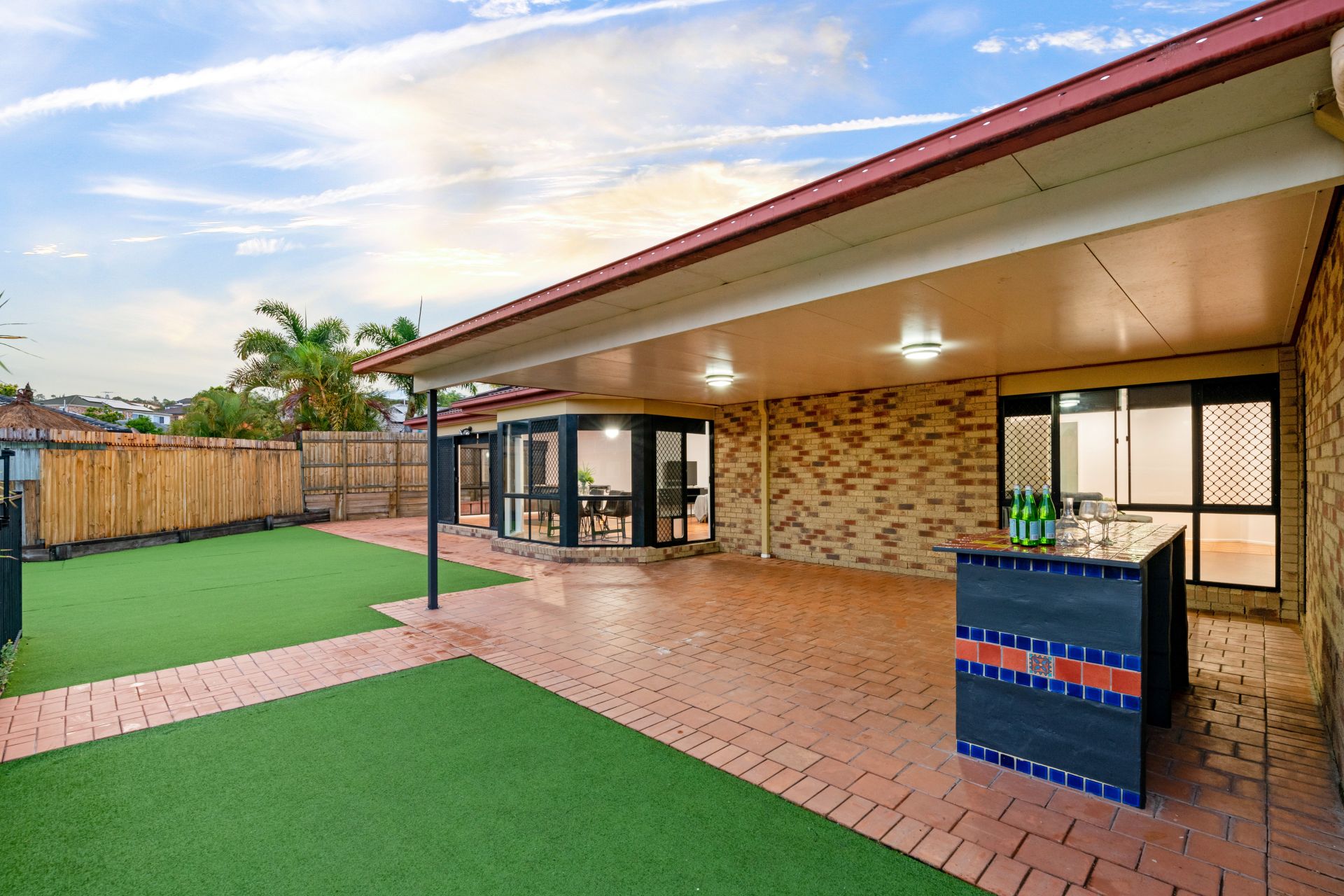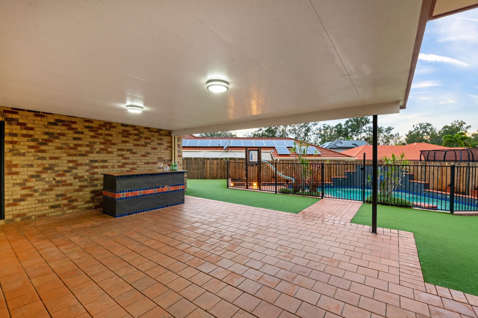 - Outdoor entertaining is available in spades. The private entertaining area off the home's dining room is overlooks the back yard and in-ground pool. With built-in bar and insulated roofing, it is the ideal place to entertain friends and family and enjoy our perfect QLD summer.