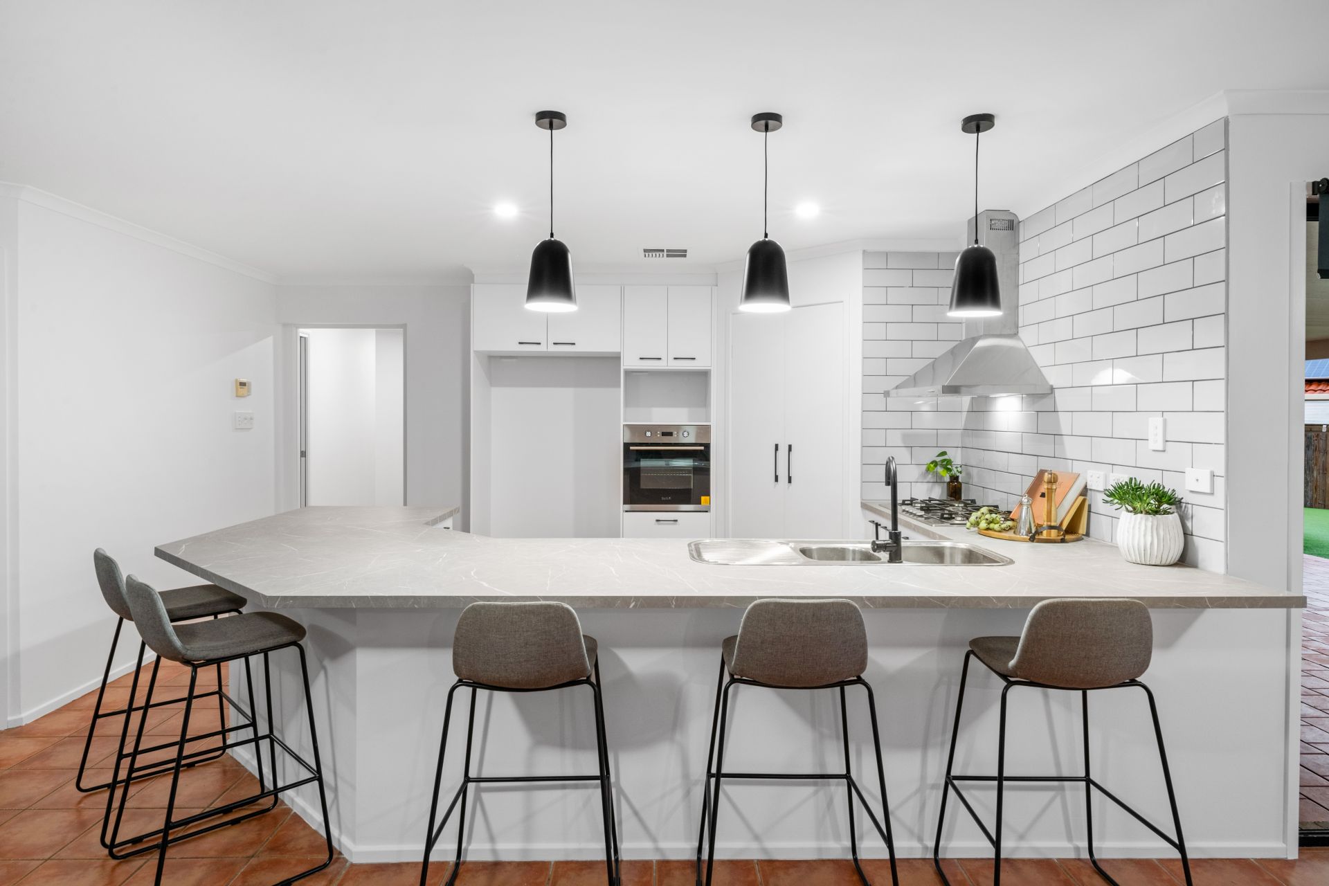 The tastefully renovated kitchen shares an enormous open plan with the home's living, dining and rumpus rooms. Features include: