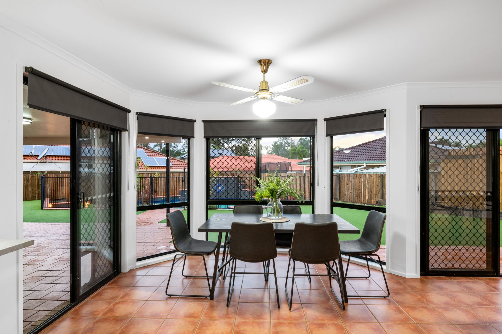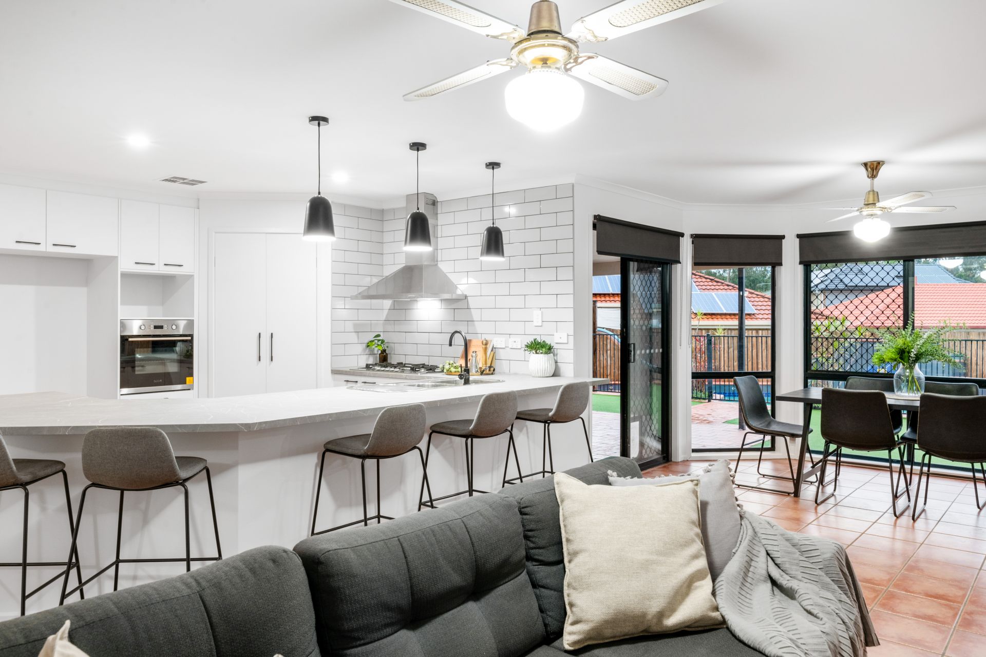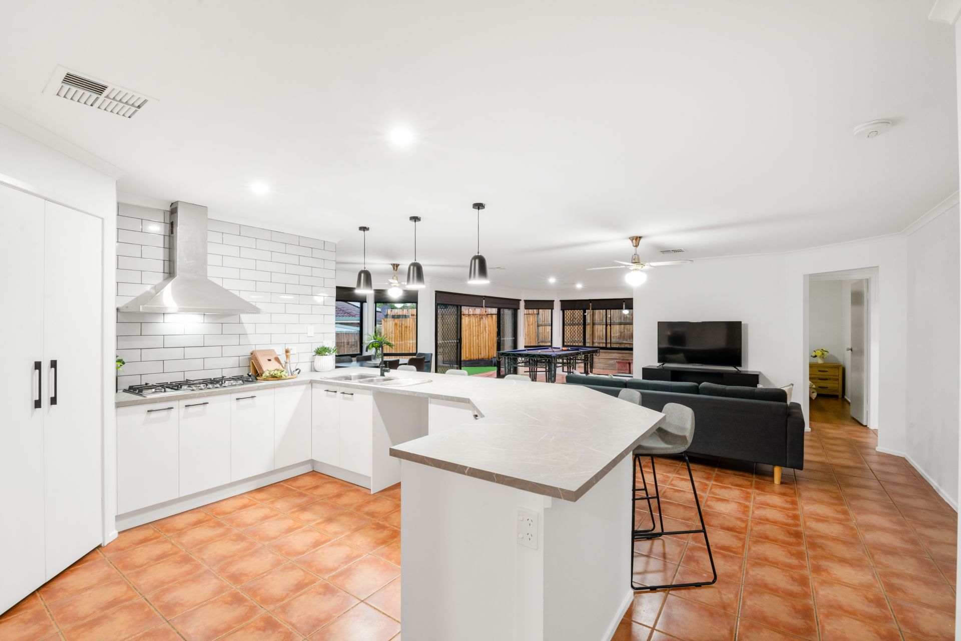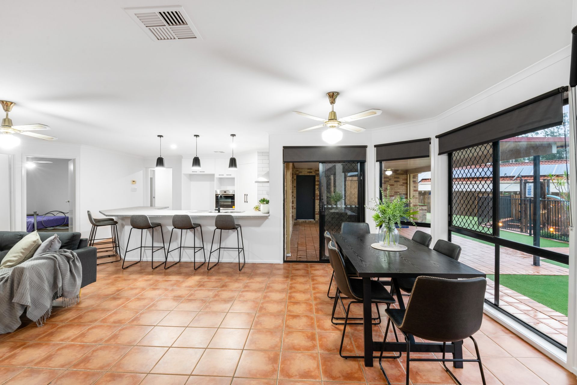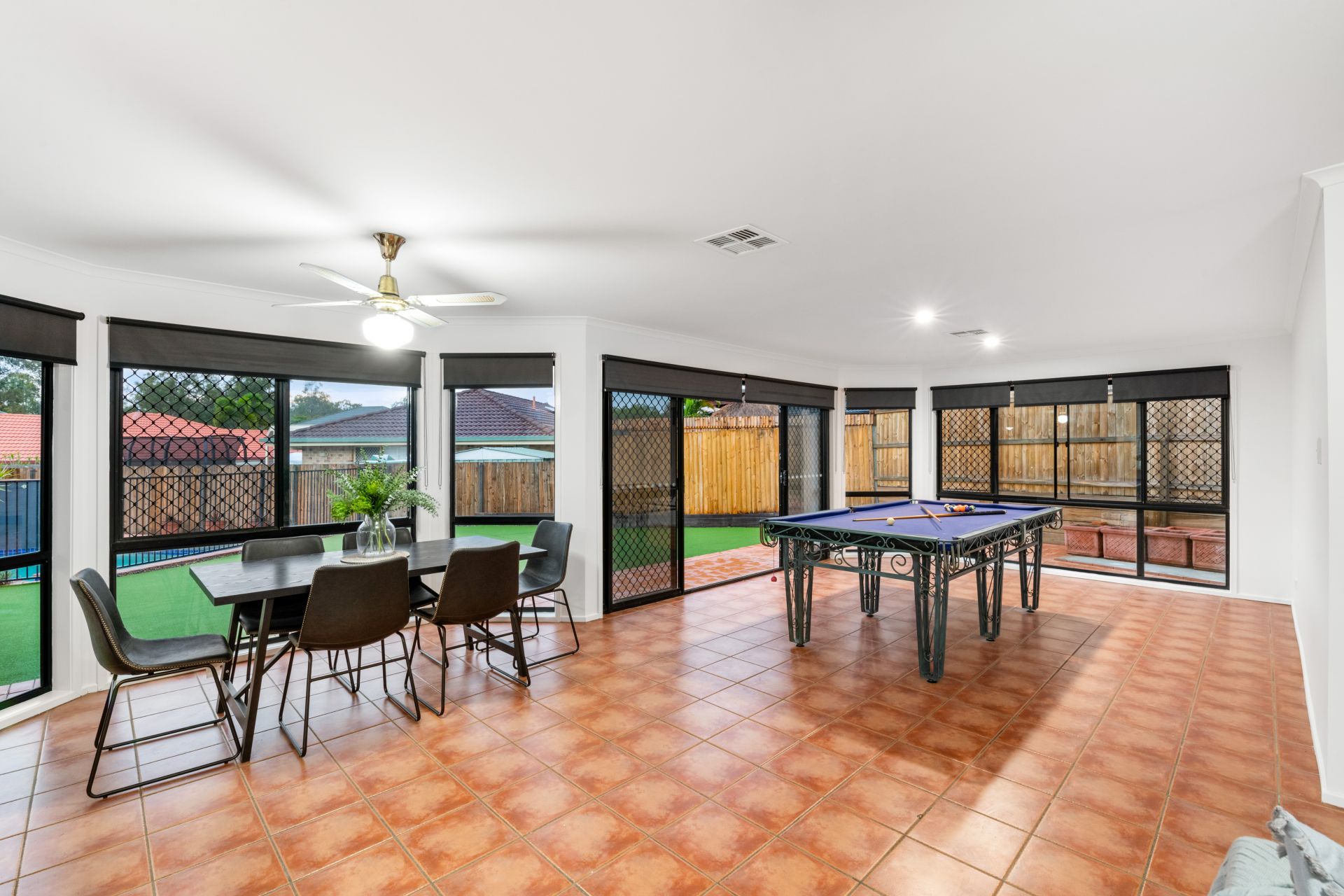 - Living, dining and rumpus rooms share one enormous open plan environment. Flooded with natural light, this cavernous room features tiled flooring, ducted air-conditioning, ceiling fans and access to both the outdoor entertaining area and back yard.