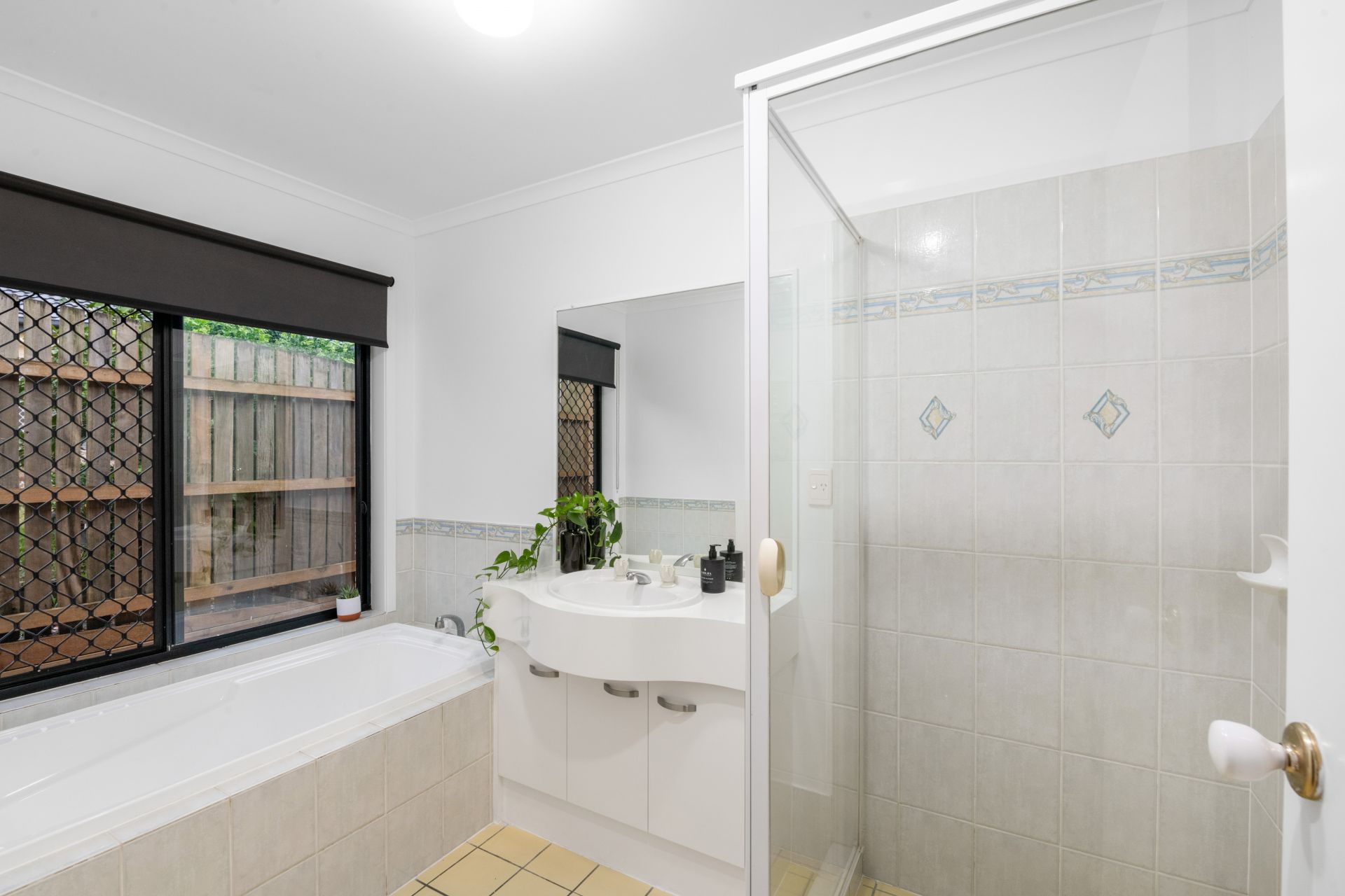 - Bathroom one is the home's main bathroom and features tiled flooring, shower, separate bath, single vanity and separate toilet.