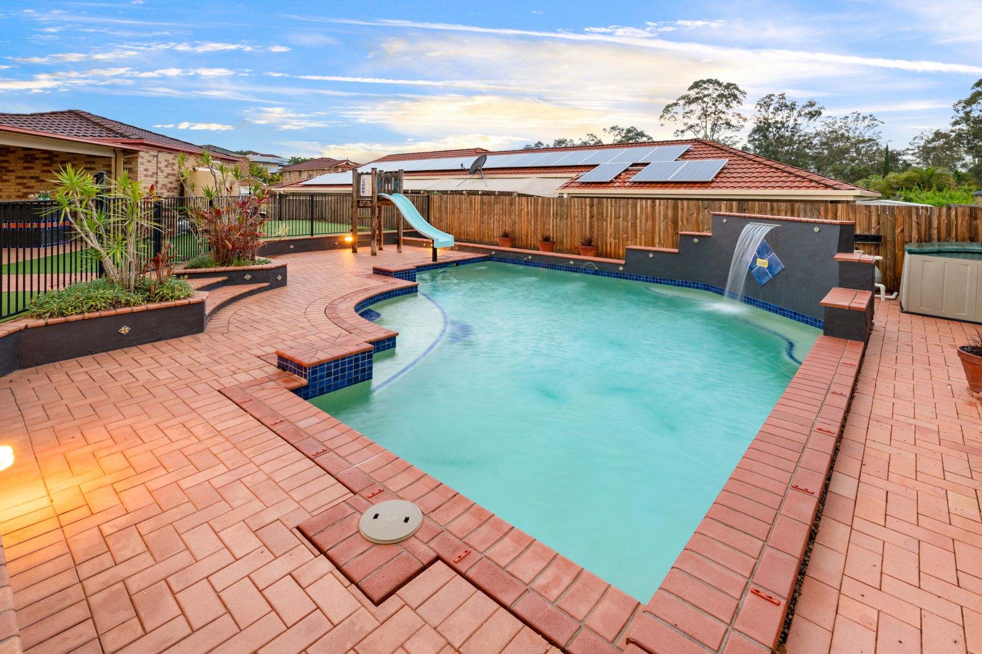 - In-ground saltwater pool with water features and slide, is like having your own personal waterpark in your own backyard.