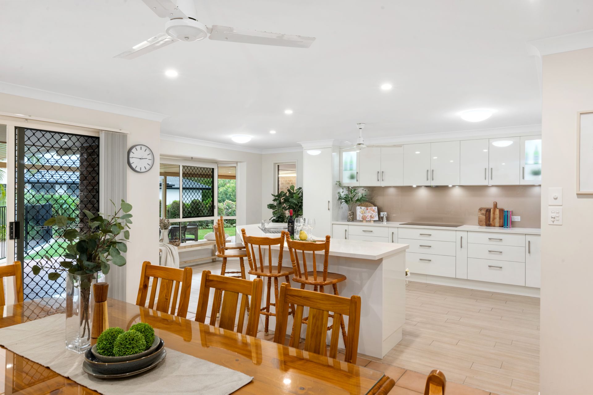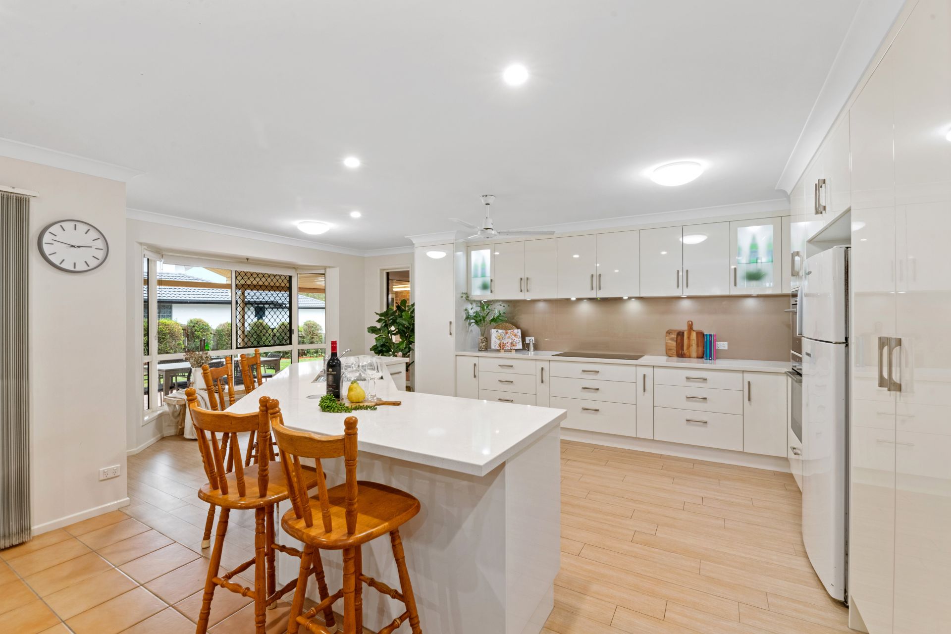 - Living room shares a large open space with the huge renovated kitchen and dining area and features tiled flooring, ceiling fan, beautiful bay window and access to the outdoor entertaining area and yard.