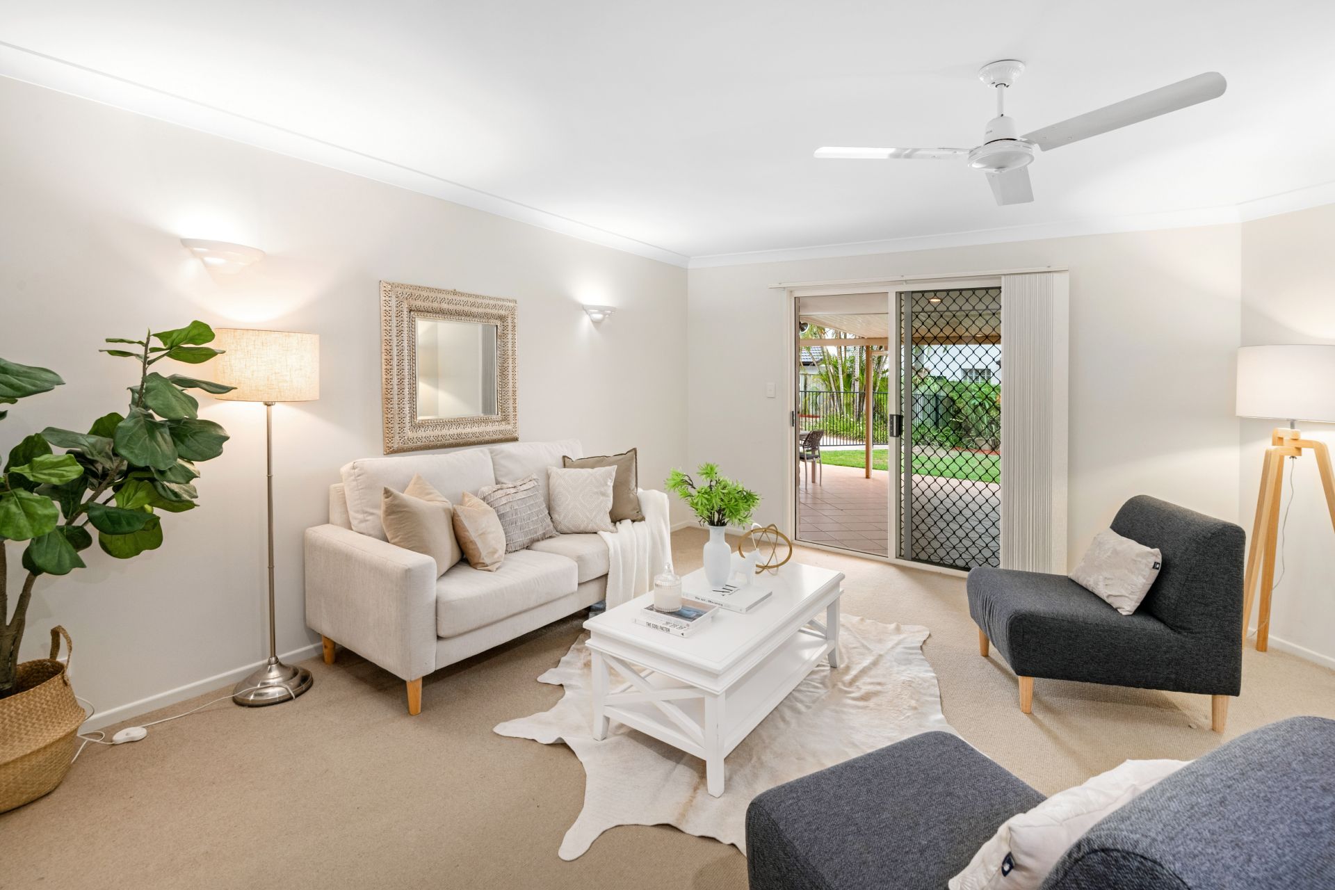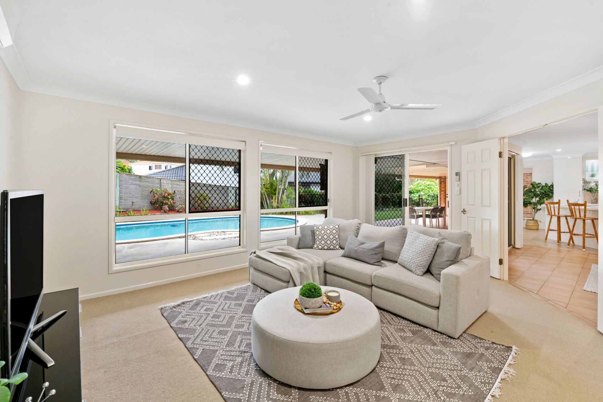 - Lounge room is separate from the home's other living spaces and features carpeted flooring, ceiling fan and access to the covered entertaining area.