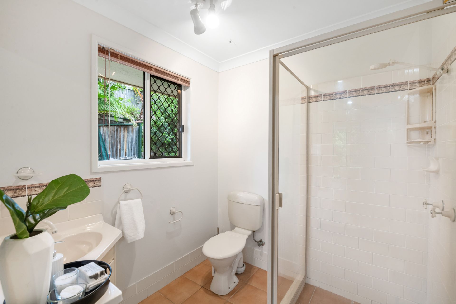 - Bathroom two is the ensuite to the master bedroom and features tiled flooring, shower, single vanity and toilet.