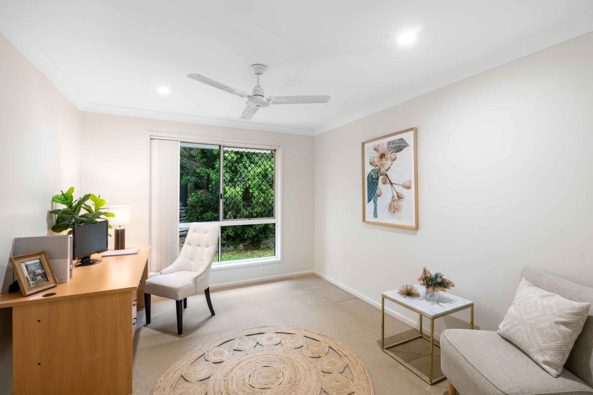 - The open study sits opposite the formal lounge and features carpeted flooring and ceiling fan.