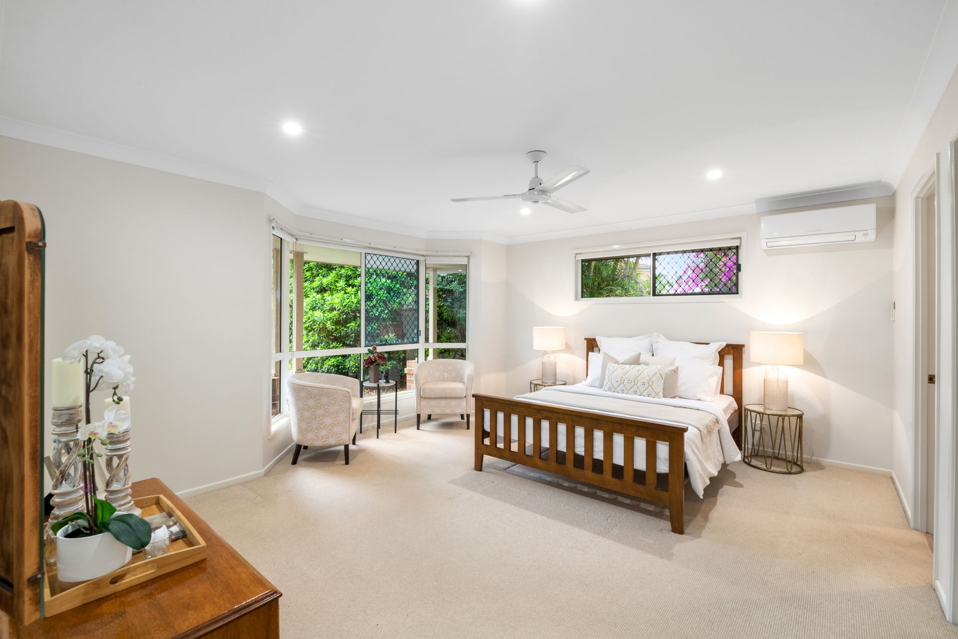 - Bedroom one is the home's spacious master bedroom. Flooded with natural light from the beautiful bay window, features include ensuite, carpeted flooring, split system air-conditioning, ceiling fan, walk-in-robe with and roll-down blinds.