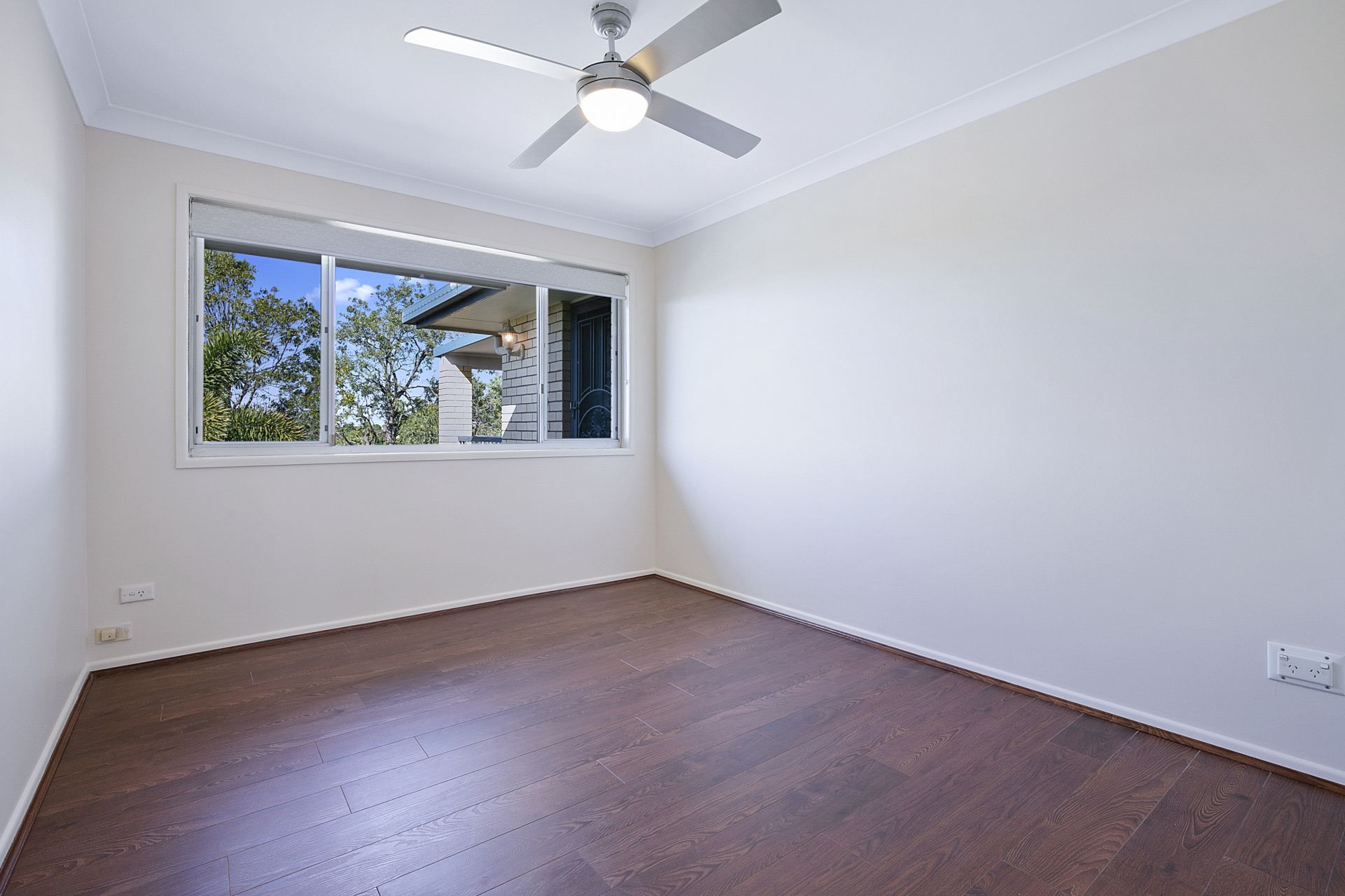 > Bedroom 4 located on the lower level features views over the garden, floating timber flooring, security screens, venetian blinds and desk space.