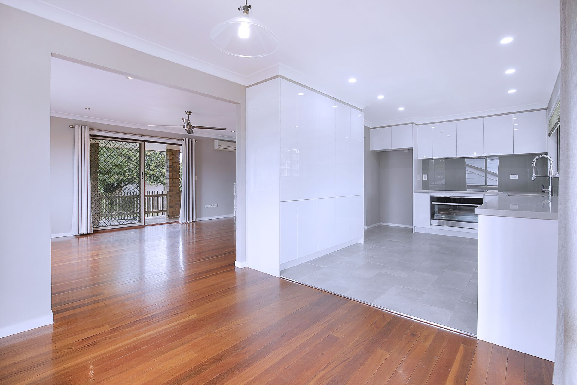 > The lounge/dining areas flow effortlessly to the kitchen and through to the outdoor entertaining areas, featuring polished timber floors, Panasonic split system air-conditioning, curtains, combination of security and fly screens, LED down-lighting and with access to the front balcony and back deck offers a seamless flow of living space