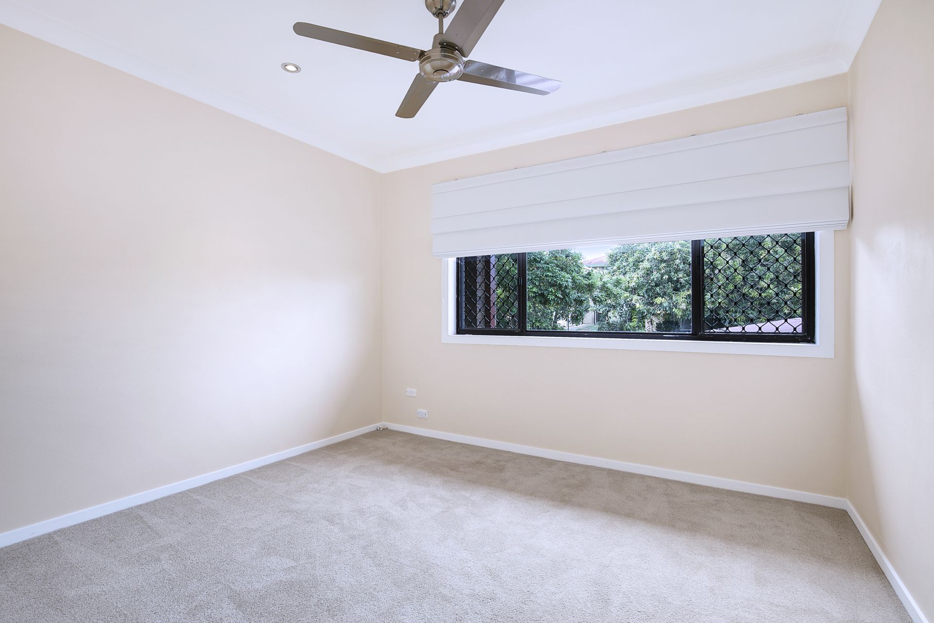 > Bedroom 3 carpet flooring, ceiling fan, roman curtains, security screens, LED down-lights plus built-in-robes