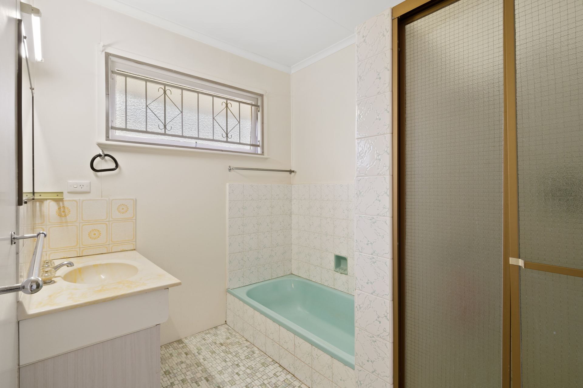 > The main bathroom features a shower with separate bath configuration, single basin vanity with plenty of storage, framed vanity mirror, towel racks, horizontal casement window and separate toilet.