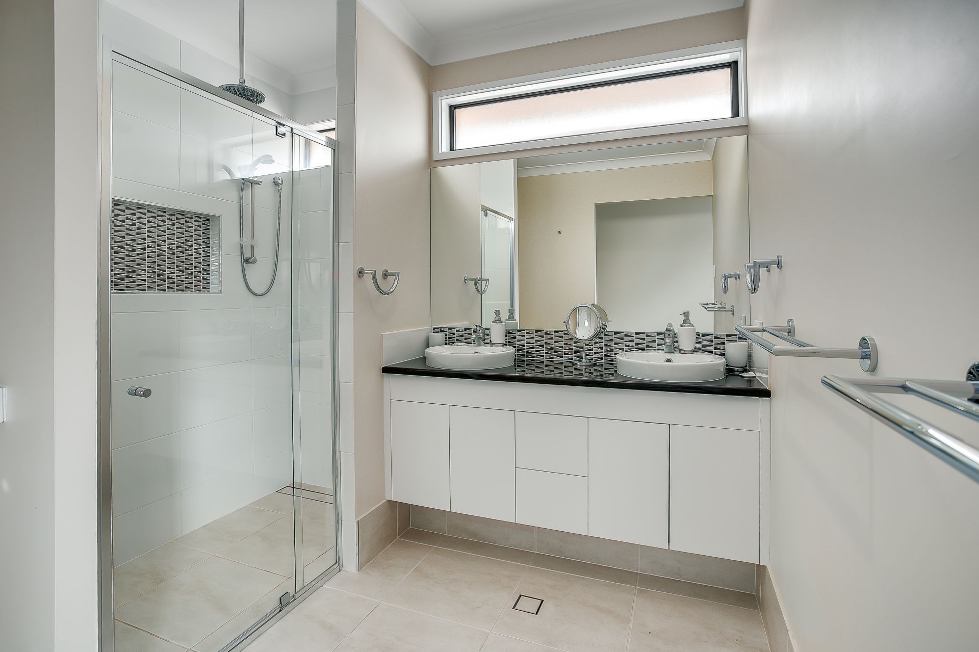 > Ensuite to the master bedroom offers tiled flooring, his & hers vanities with oversized mirror above, frosted windows, wall recess in the large shower with additional rainwater head, toilet, exhaust fan/heater/light combo.