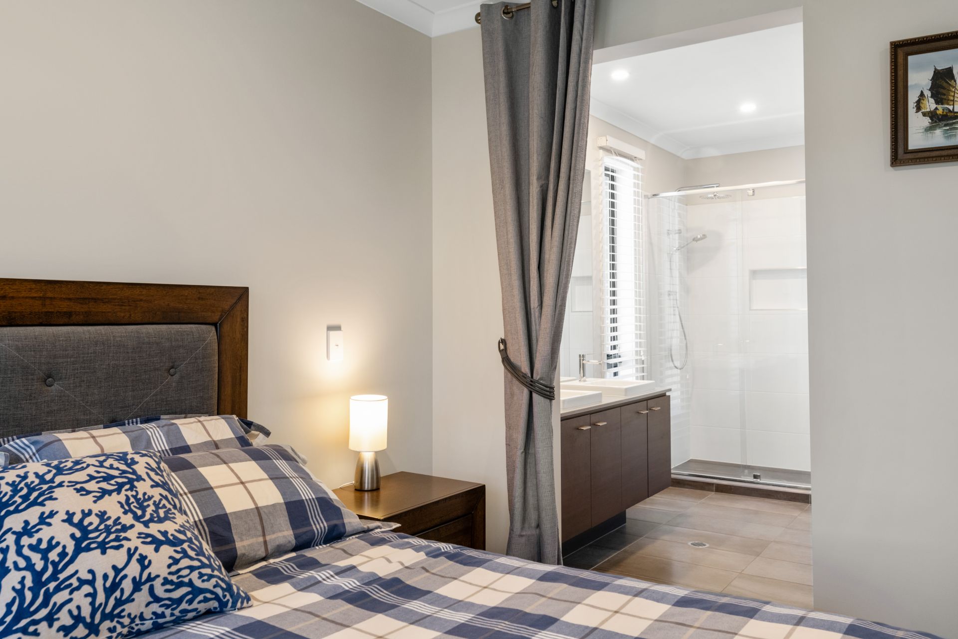 - Bathroom two is the spacious ensuite to the master bedroom and features tiled flooring, over-sized shower with rainfall showerhead, double vanity with stone benchtop and soft-close cabinetry, and separate toilet.