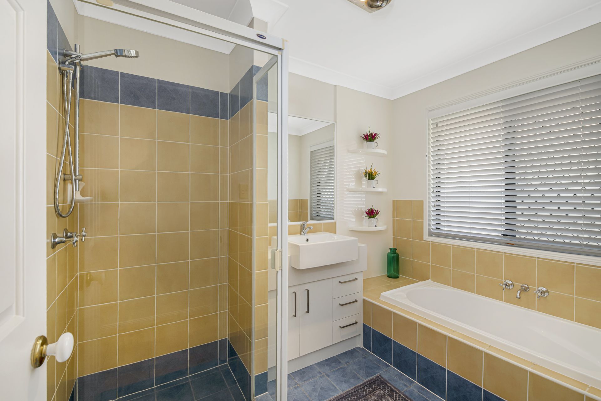 - Bathroom one is the home's main bathroom and features tiled flooring, shower, bath, modern single vanity with stone benchtop and soft-close cabinetry, and separate toilet.